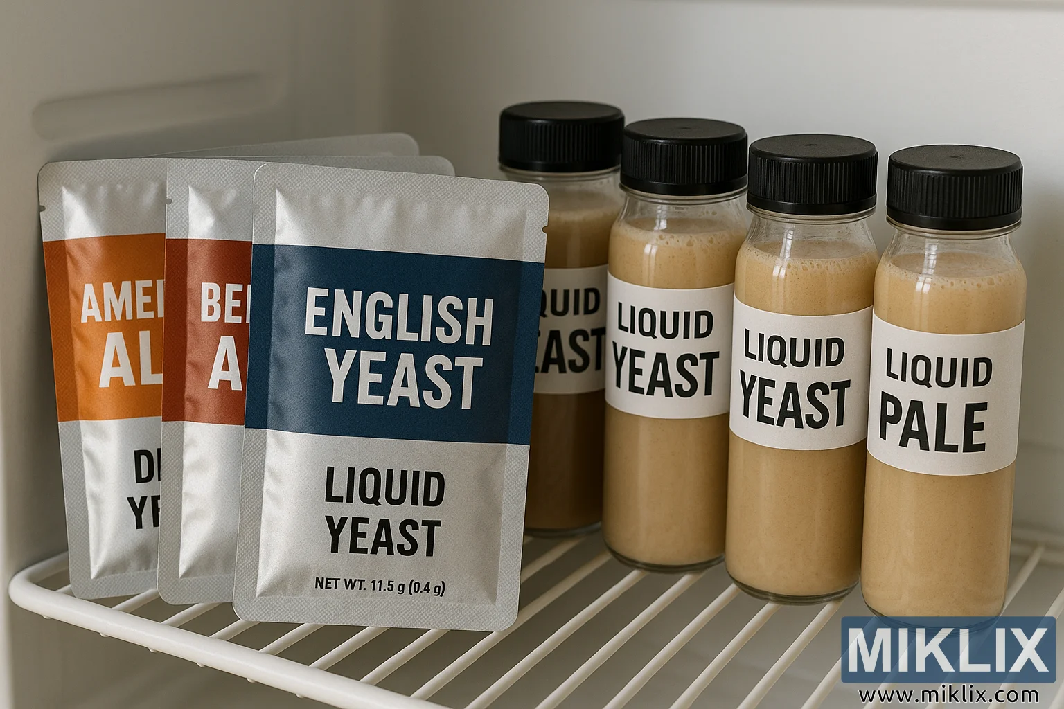 מימין לחבילות, ארבעה בקבוקים שקופים של שמרים נוזליים מסודרים בשורה זהה. בקבוקים אלה מלאים בתמיסה קרמית וחומה בהירה, כאשר תאי השמרים התלויים נראים מבעד לפלסטיק השקוף. עקביות הנוזל מרמזת על רעננות ופעילות, תרבית חיה מוכנה להזריקה לתירוש. כל בקבוק נושא תווית לבנה עם כיתוב שחור מודגש "LIQUID YEAST" או "LIQUI PALE", המציין את הזן או את סגנון הבירה המיועד. אחידות התוויות ובהירות הבקבוקים תורמות לתחושת הסדר והמקצועיות הכללית.