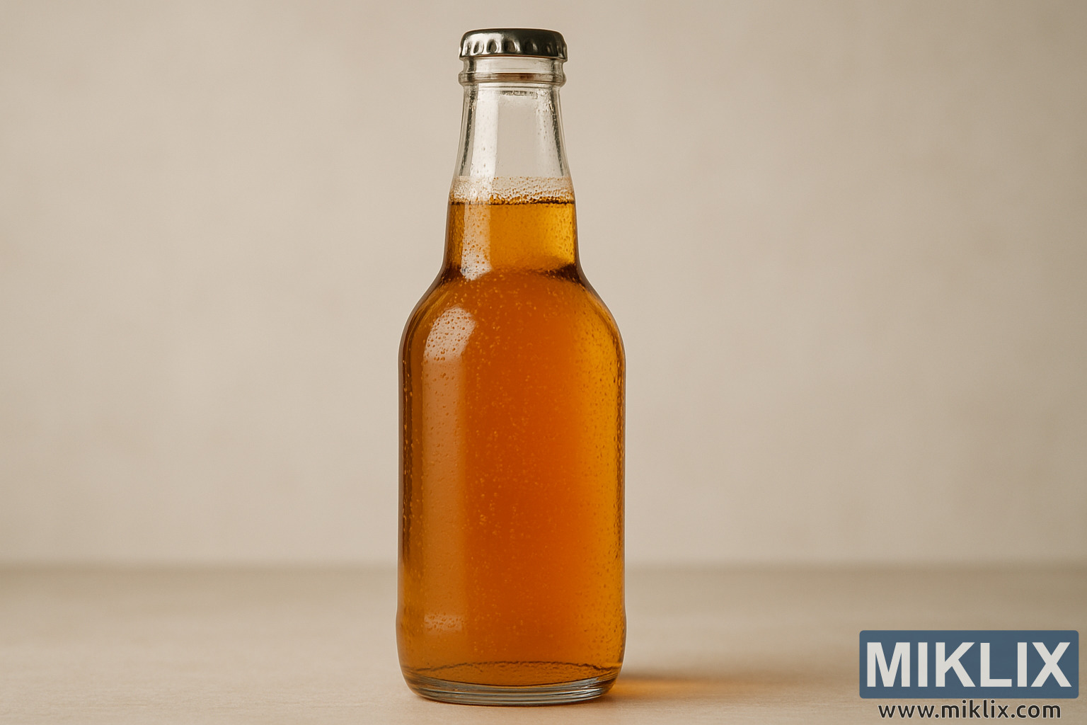 התמונה מתארת תצלום מוצר טהור, מקרוב, של בקבוק זכוכית שקוף מלא בנוזל עשיר בצבע ענברי. הבקבוק עומד זקוף על משטח חלק בגוון ניטרלי, המשקף בעדינות חלק מהגוונים החמים מהתכולה שבפנים. צורתו קלאסית ומעוגלת מעט, עם קימורים עדינים שלוכדים את האור בעדינות. טיפות זעירות של עיבוי נצמדות לחלק החיצוני של הזכוכית, מדגישות את מצבו הקר של הבקבוק ומעצימות את תחושת הרעננות. בתוך הבקבוק, בועות תוססות זעירות עולות מהבסיס לכיוון הצוואר, ומוסיפות איכות דינמית ותוססת לקומפוזיציה הרגועה. התאורה רכה, מפוזרת וממוקמת בקפידה כדי לבטל צללים קשים, תוך הדגשת קווי המתאר הנקיים של הבקבוק ואת האופי הזוהר של הנוזל הענברי. רקע בז' עמום מספק רקע דיסקרטי המאפשר לבקבוק לבלוט באופן בולט ללא הסחת דעת ויזואלית. אין תווית או מיתוג, מה שמעניק לתמונה אסתטיקה טהורה ומינימליסטית שיכולה להתאים בקלות למשקאות אומנותיים שונים כמו קומבוצ'ה, סודה בוטיק או מוצרי בירה מיוחדים. הקומפוזיציה הכוללת משדרת בהירות, איכות, עידון ואומנות, עם דגש על מרקמים טבעיים, תאורה עדינה ופשטות אלגנטית של הנושא.