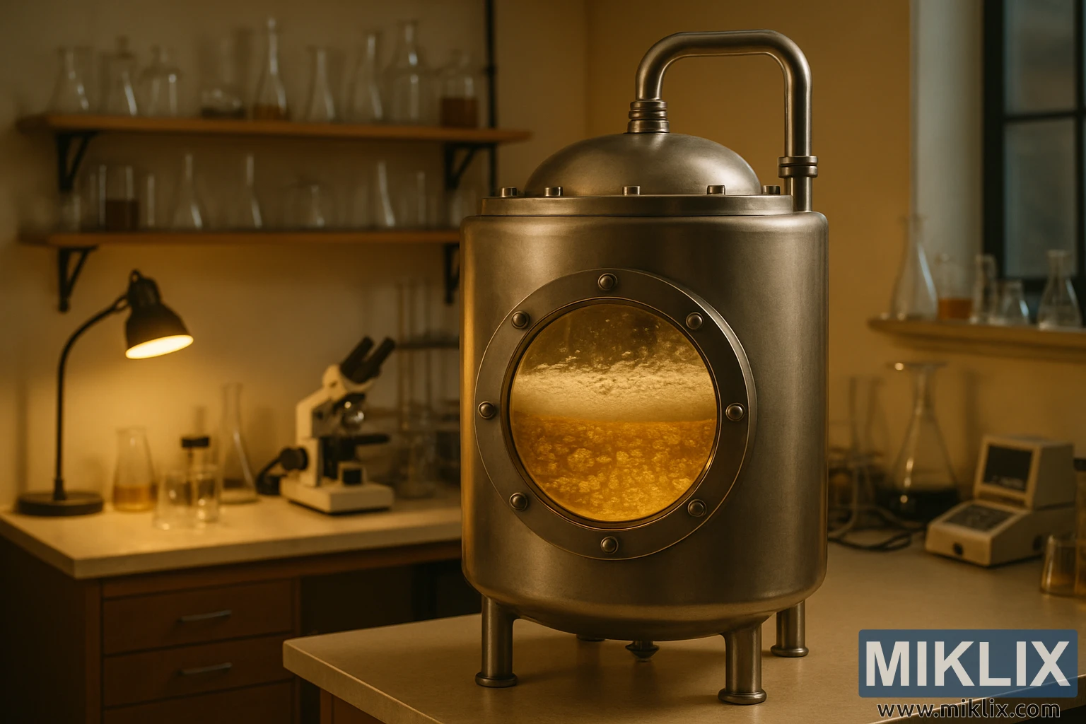 סצנת מעבדה חמה הכוללת מיכל תסיסה מפלדת אל-חלד עם חלון זכוכית המציג תסיסה פעילה, מוקף במכשירים מדעיים ותאורה זהובה.