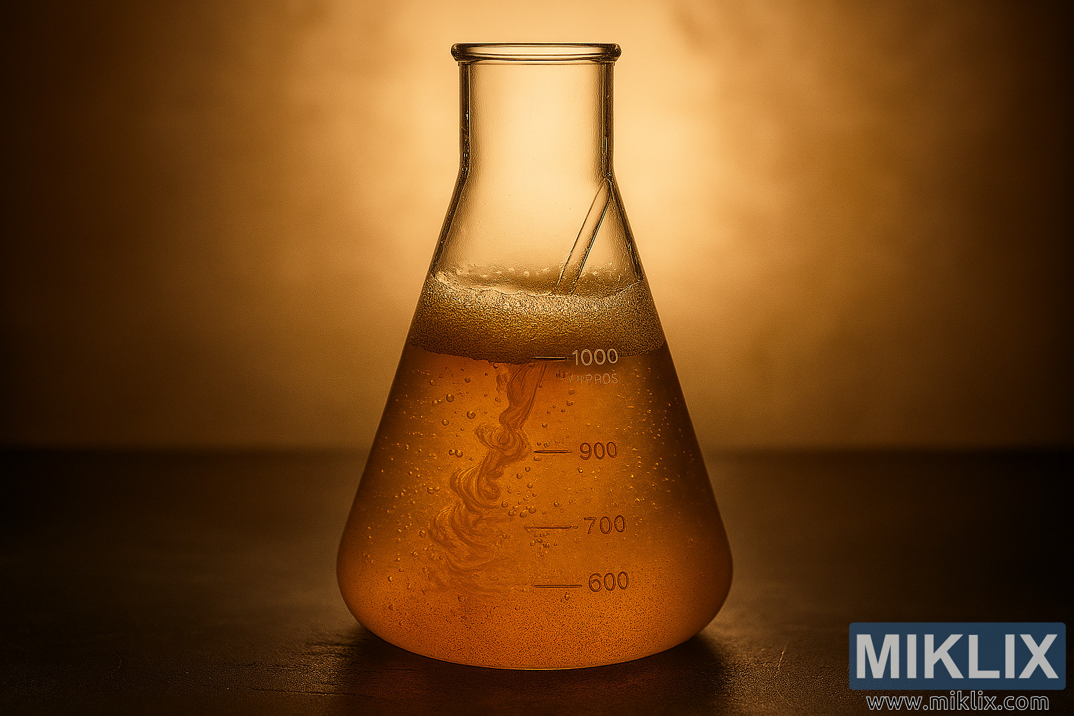 התמונה מציגה תקריב מרשים של רגע של בישול מדעי, שבמרכזו בקבוק ארלנמאייר מזכוכית פריכה מלאה בתרבית שמרים מסתחררת. הבקבוק, העשוי מזכוכית בורוסיליקט ברמת מעבדה, ניצב גבוה וחרוטי עם צוואר צר ובסיס רחב, חרוט בסימני מדידה לבנים מדויקים במיליליטר. סימונים אלה - "1000 בקירוב", "900", "800" ו-"700" - מציינים את נפח הנוזל הזהוב שבפנים, המגיע מעט מתחת לקו 900 מ"ל.