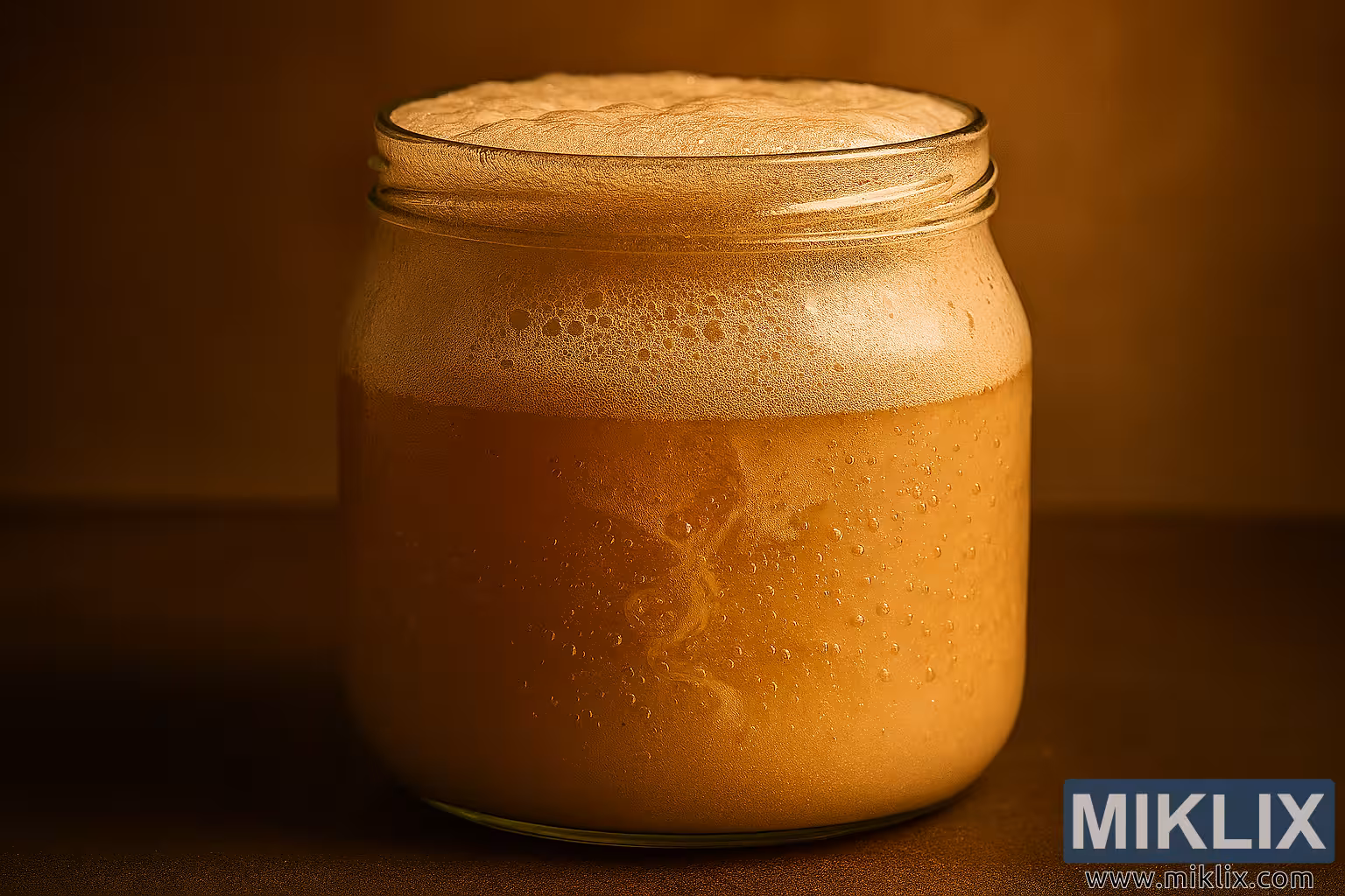 בתוך הצנצנת, חומר התחלתי של השמרים מציג גוון בז' עשיר וקרמי, מעט אטום ועכור, דבר המצביע על תרחיף צפוף של תאי שמרים פעילים. פני השטח מעוטרים בראש קצף עבה וקצף, בצבע לבן-שבור ובעל מרקם של אינספור בועות זעירות. בועות אלו משתנות בגודלן ובצפיפותן, ויוצרות צורה דמוית כיפה המתקרבת לשיא במרכז ומשופעת בעדינות לכיוון הקצוות. הקצף נראה לח ותוסס, עם ברק מבריק המשקף את התאורה הרכה.