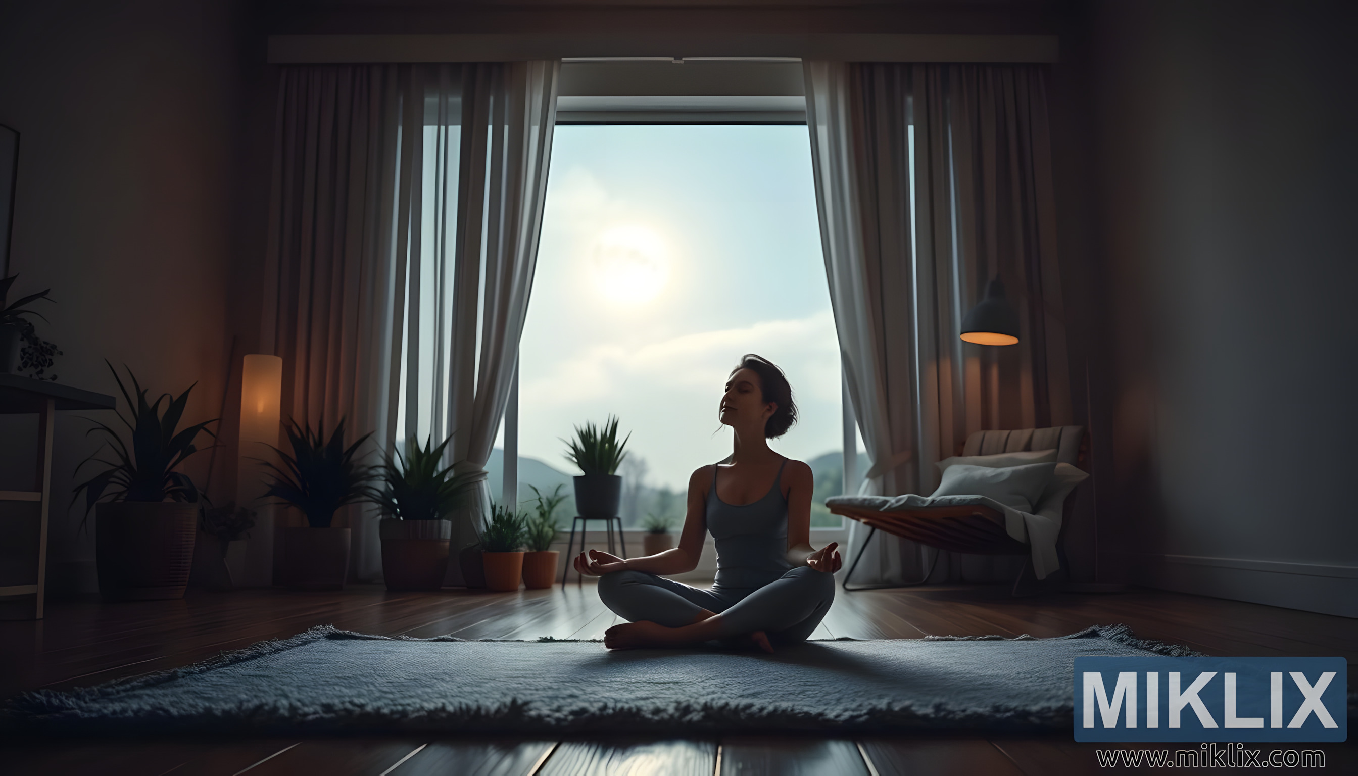 Serene bedroom scene with a person meditating on a yoga mat, surrounded by plants and moonlight, evoking relaxation, calm, and restful sleep.