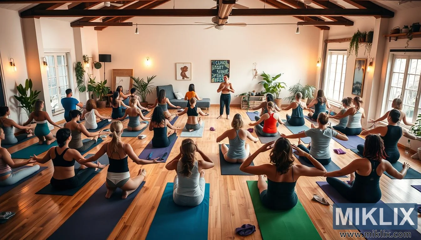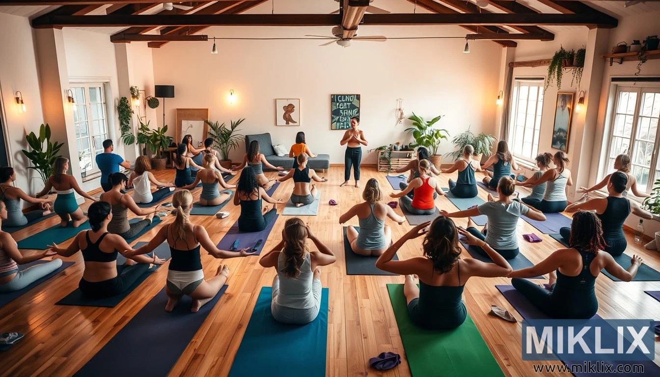 Yoga studio filled with diverse practitioners in warm lighting, guided by instructors, creating a serene, connected atmosphere of well-being and mindfulness.