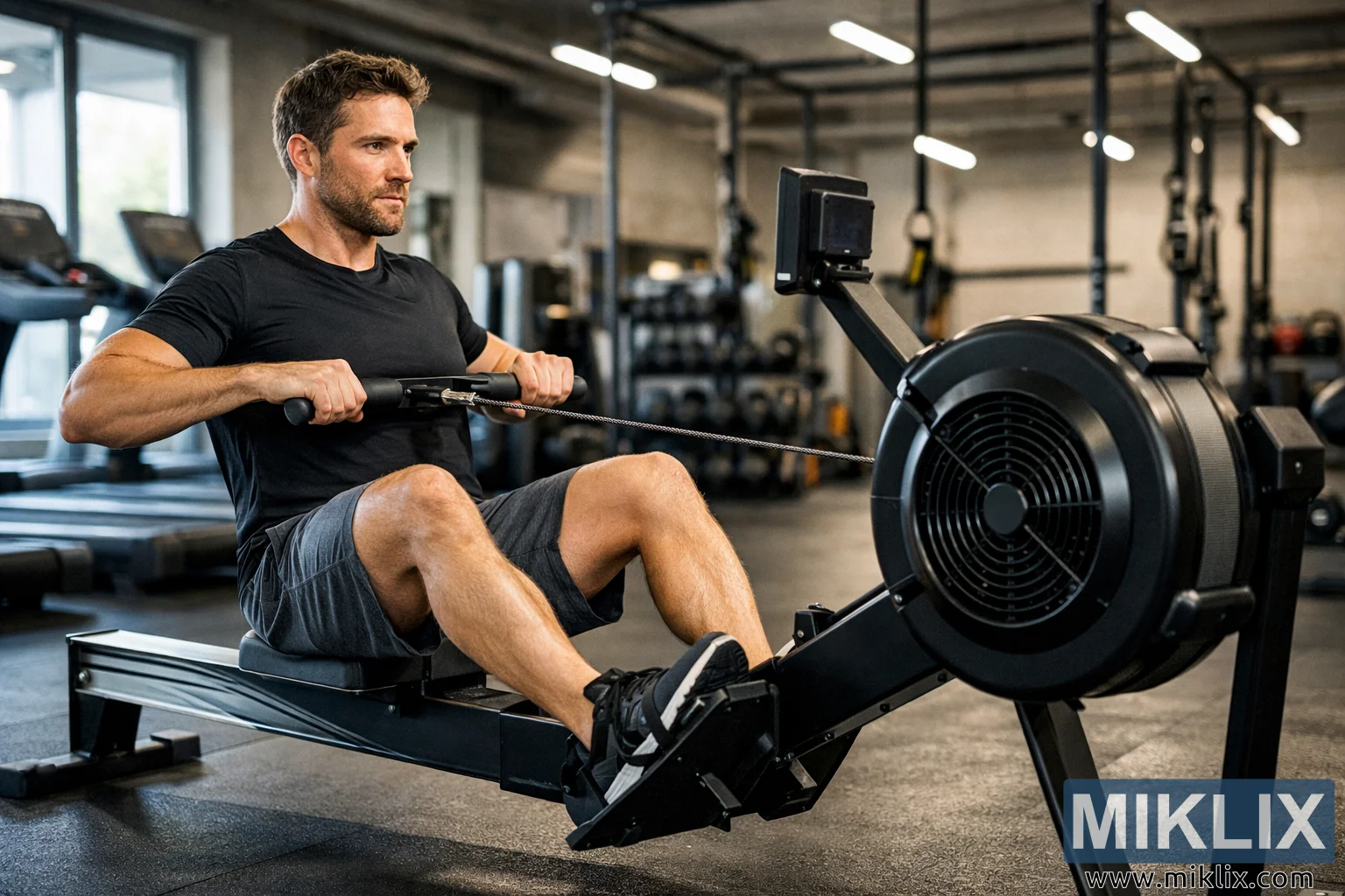 Image: Focused Athlete on Rowing Machine in Modern Gym