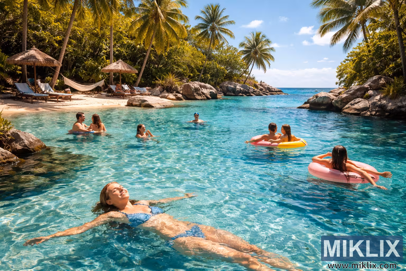 In the background, the scene opens to a deeper blue horizon where the lagoon meets the open ocean. A few distant swimmers appear as tiny dots against the vastness of sea and sky, reinforcing the feeling of space and freedom. The overall mood is one of effortless tranquility: no hurried movements, no signs of tension, only gentle motion, warm light, and the quiet social harmony of people sharing a peaceful place. The image communicates how swimming in a tropical environment can melt away stress, replacing it with buoyancy, warmth, and a subtle joy that lingers long after leaving the water.