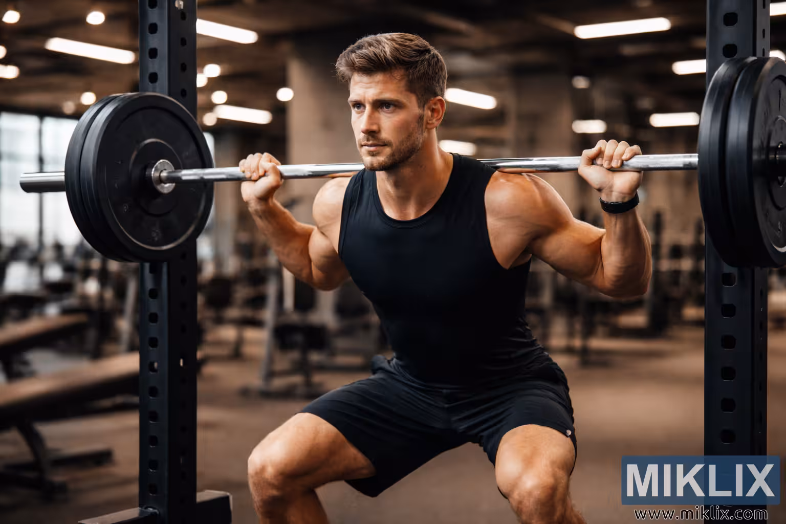 He is wearing a sleeveless black athletic top that exposes well-defined shoulders, arms, and chest, paired with black training shorts. A dark wristwatch is visible on his left wrist, adding a subtle real-world detail that grounds the scene in everyday fitness culture. The steel barbell rests firmly across the top of his back, gripped evenly with both hands just outside shoulder width. Thick black weight plates are secured on both ends of the bar, emphasizing the heaviness of the load. His posture is strong and balanced, knees bent and hips pushed back in the bottom phase of the squat, demonstrating proper lifting technique.