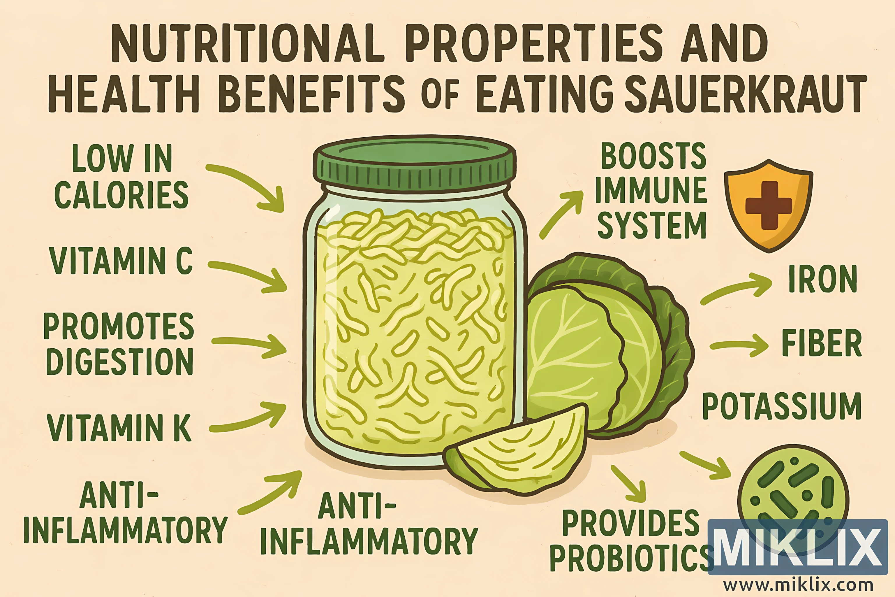 Discover the nutritional value and health benefits of sauerkraut in this vibrant infographic featuring probiotics, vitamins, and gut health insights.