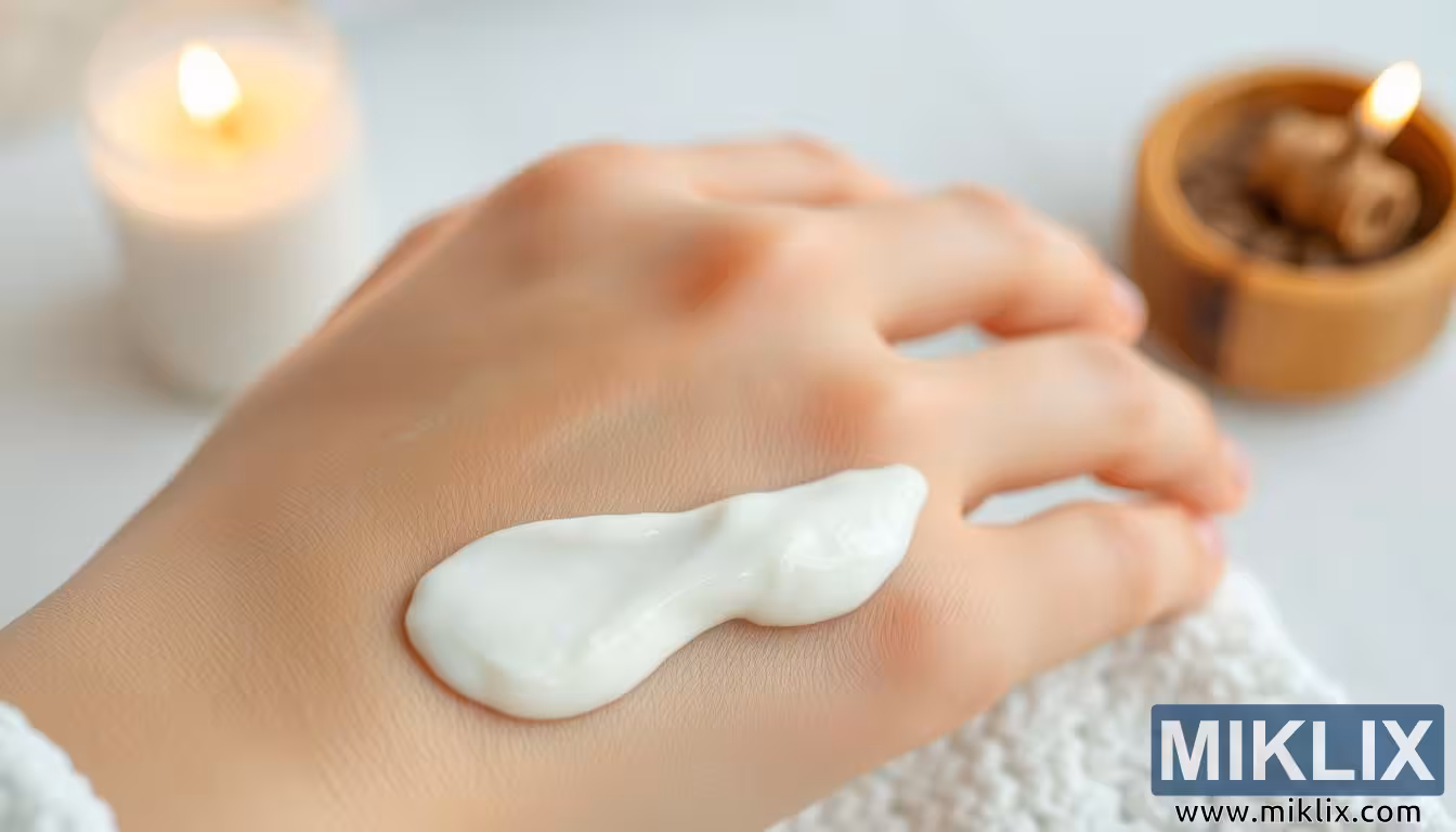 The image portrays a close-up view of a hand with a generous application of creamy white yogurt spread across the skin, immediately evoking a sense of nourishment, hydration, and care. The yogurt’s thick, velvety consistency is striking, resting lightly on the back of the hand, and its smooth texture is highlighted by the soft, ambient lighting. The skin beneath appears naturally radiant and healthy, with an even, glowing tone that enhances the impression of wellness and rejuvenation. Every detail of the scene is designed to evoke calm and serenity, from the gentle blur of the background to the warm, diffused candlelight casting a subtle golden glow. The softly flickering candles, one placed in a simple wooden holder and the other in a minimalist white vessel, contribute to a spa-like atmosphere that feels both restorative and luxurious. The surrounding palette of muted creams, whites, and natural tones emphasizes purity and tranquility, allowing the focus to remain on the nourishing qualities of the yogurt and the smoothness of the skin.