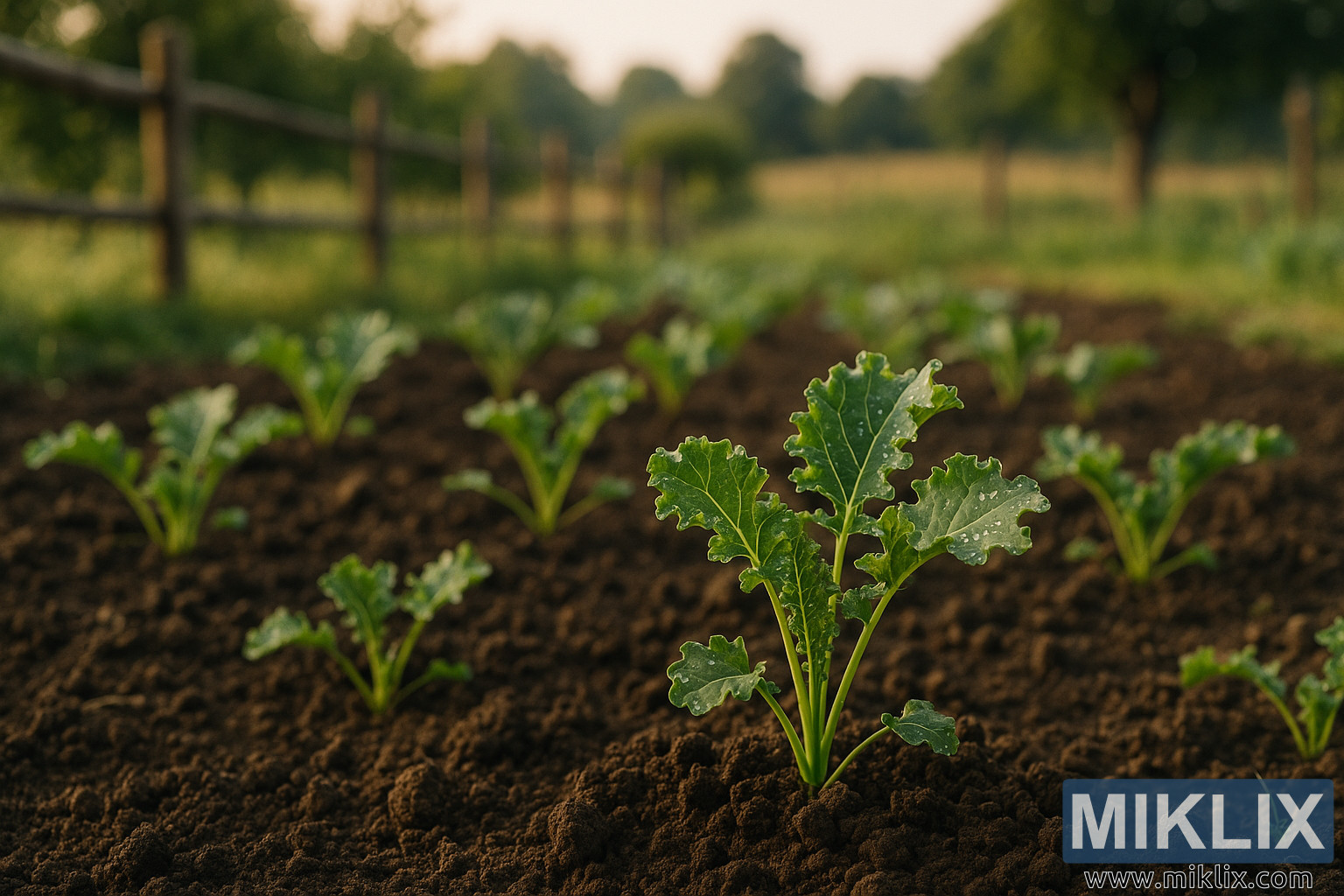 सुबह की रोशनी में एक शांत गांव के बगीचे में, ओस की बूंदों से ढके हुए, कोमल छोटे केल के पौधों की लाइनें दिख रही हैं, जो एक देहाती लकड़ी की बाड़ के पास, और उसके आगे खुले हरे-भरे खेतों के पास, अच्छी भूरी मिट्टी में उग रहे हैं।