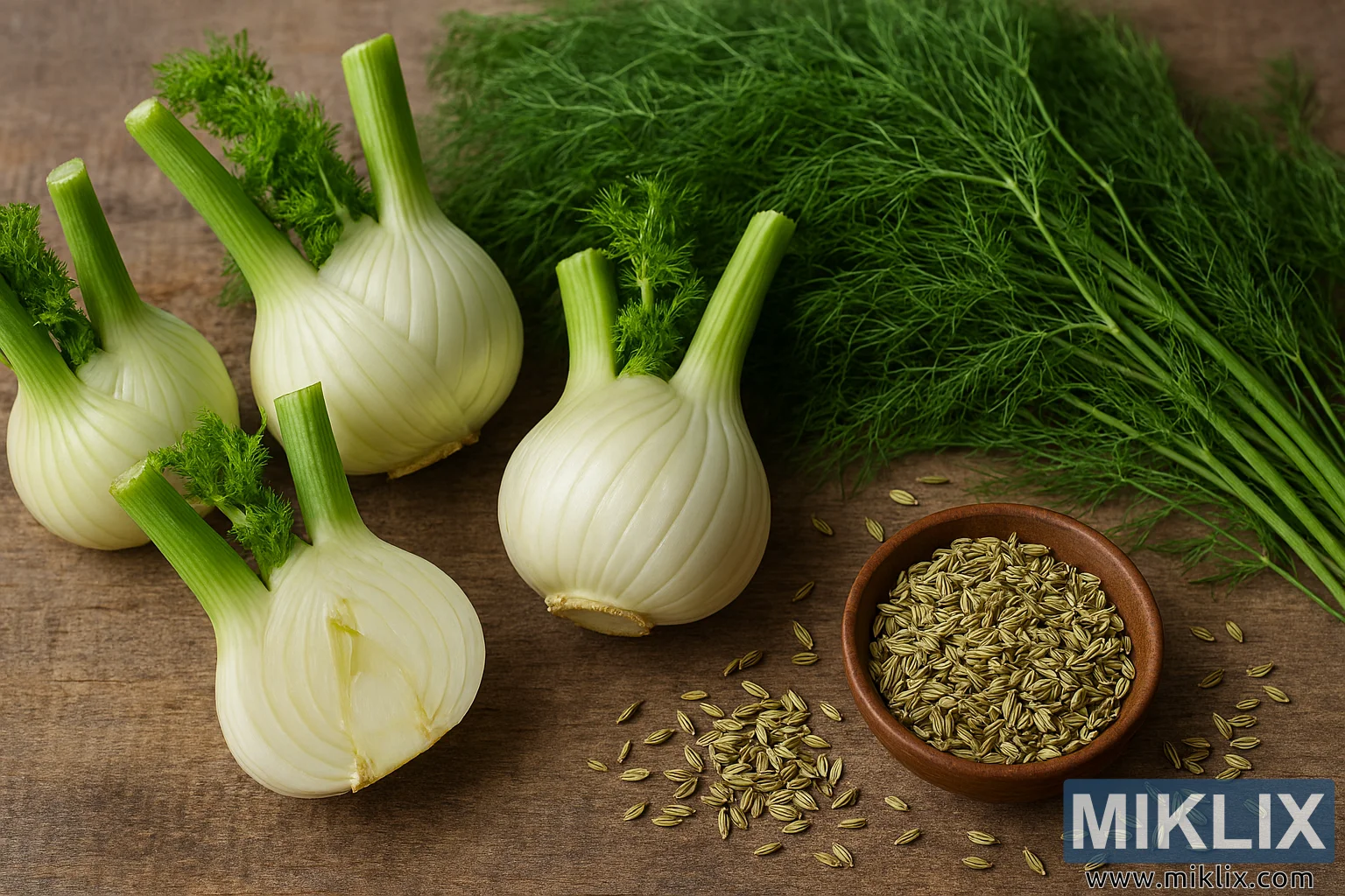 सौंफ के कटे हुए हिस्सों की हाई-रिज़ॉल्यूशन इमेज, जिसमें बल्ब, पत्ते और बीज शामिल हैं, जिसे देहाती लकड़ी के बैकग्राउंड पर खाना बनाने के लिए स्टाइल किया गया है।