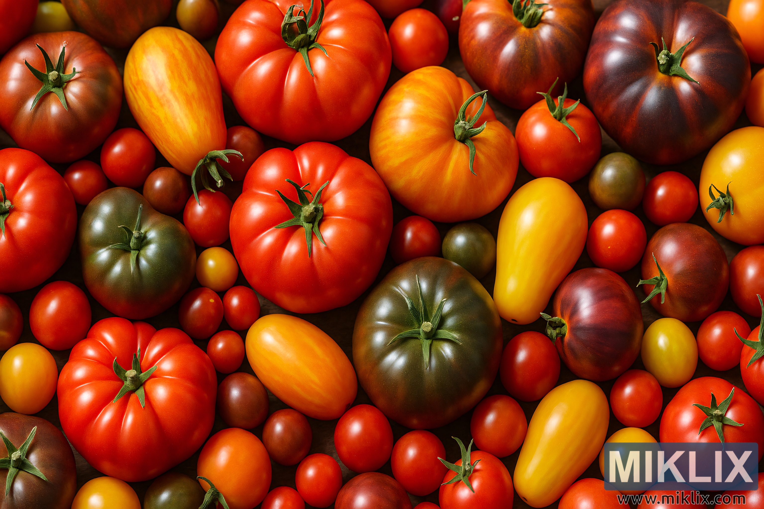 यह इमेज रंग-बिरंगे पुराने टमाटरों का एक शानदार और देखने में बहुत अच्छा कलेक्शन दिखाती है, जो पूरे फ्रेम में एक-दूसरे पर फैले हुए हैं। यह फ़ोटो लैंडस्केप ओरिएंटेशन में ली गई है, जिससे टमाटर की कई तरह की किस्में दिखाई देती हैं, जिनमें से हर एक का अपना खास आकार, साइज़, रंग और सतह का टेक्सचर है। गहरे लाल, जले हुए नारंगी और सुनहरे पीले रंग के बड़े, धारीदार बीफ़स्टीक टमाटर छोटे, चिकने छिलके वाले चेरी और अंगूर टमाटरों के बीच खास तौर पर दिखते हैं। कुछ टमाटरों में हल्के ग्रेडिएंट दिखते हैं जो हरे से लाल या पीले से नारंगी हो जाते हैं, जो पुराने किस्म की किस्मों में पाए जाने वाले कुदरती बदलाव को दिखाते हैं। रंगों में चमकदार लाल, हल्का बरगंडी, लगभग काला बैंगनी, गहरा एम्बर, शहद जैसा सुनहरा और चूने जैसी धारियों वाला हरा रंग शामिल है, जो एक शानदार विज़ुअल स्पेक्ट्रम देता है जो तुरंत ध्यान खींचता है।