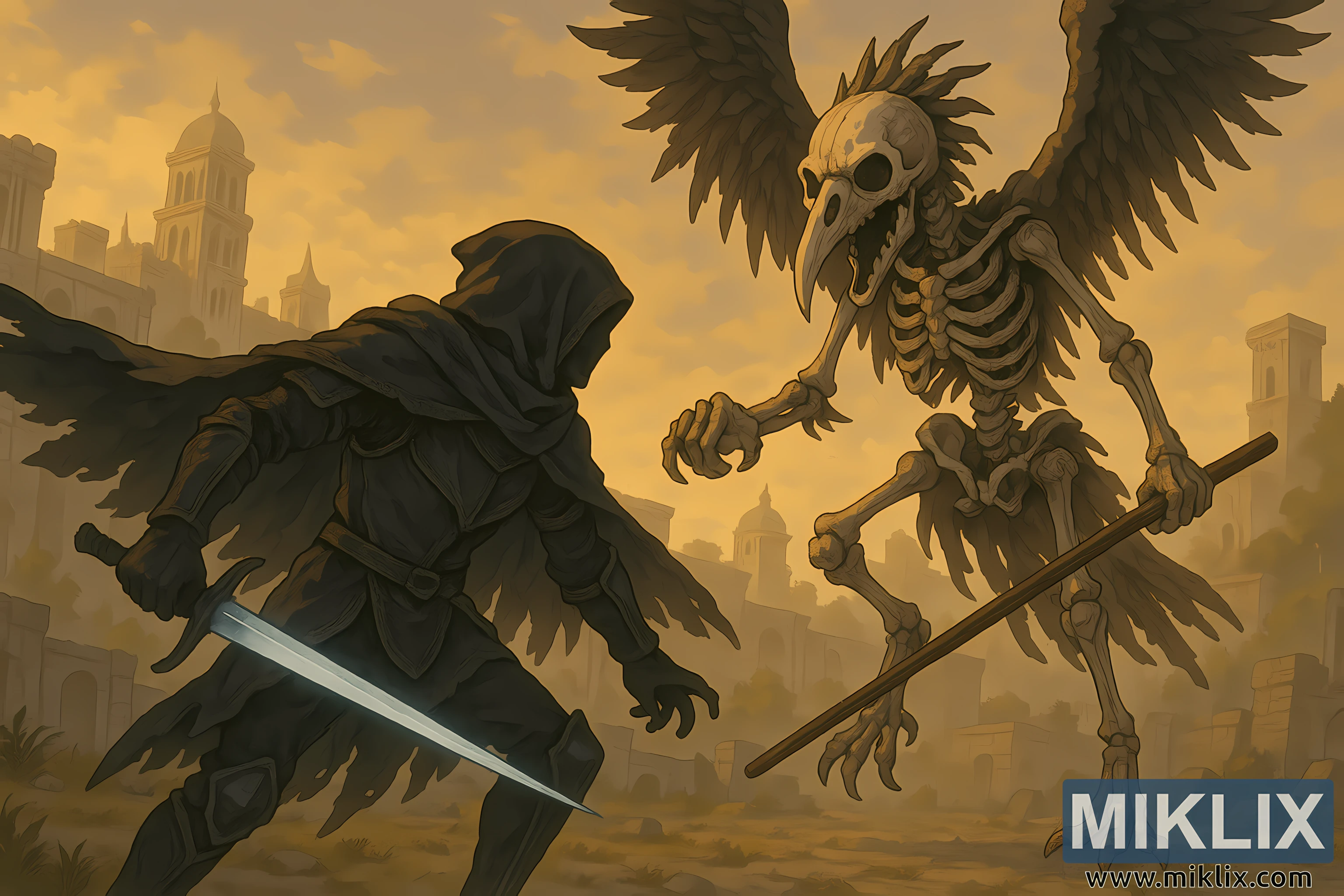 टार्निश्ड के सामने डेथबर्ड है—दुबला-पतला, लंबा, और लगभग पूरी तरह से खुली हड्डियों से बना। उसकी खोपड़ी जैसी चोंच चुपचाप धमकी देते हुए खुली रहती है, खाली आँखें खोखली नफरत से घूरती रहती हैं। पंख जैसी पतली आकृतियाँ उसकी पसलियों और पंखों के जोड़ों से चिपकी रहती हैं, लेकिन यह जीव ज़्यादातर हड्डियों का ढांचा है, जिसकी रीढ़ मुड़ी हुई है, पसलियाँ हैं, और पंजे जैसे पैर पक्षी जैसी मुद्रा में फैले हुए हैं। इसके बड़े पंख बाहर और ऊपर की ओर फैले हुए हैं, चमकते आसमान के सामने गहरे रंग के, पंखों जैसे सिल्हूट बनाते हैं जो इसके आकार और अजीब रूप पर ज़ोर देते हैं।