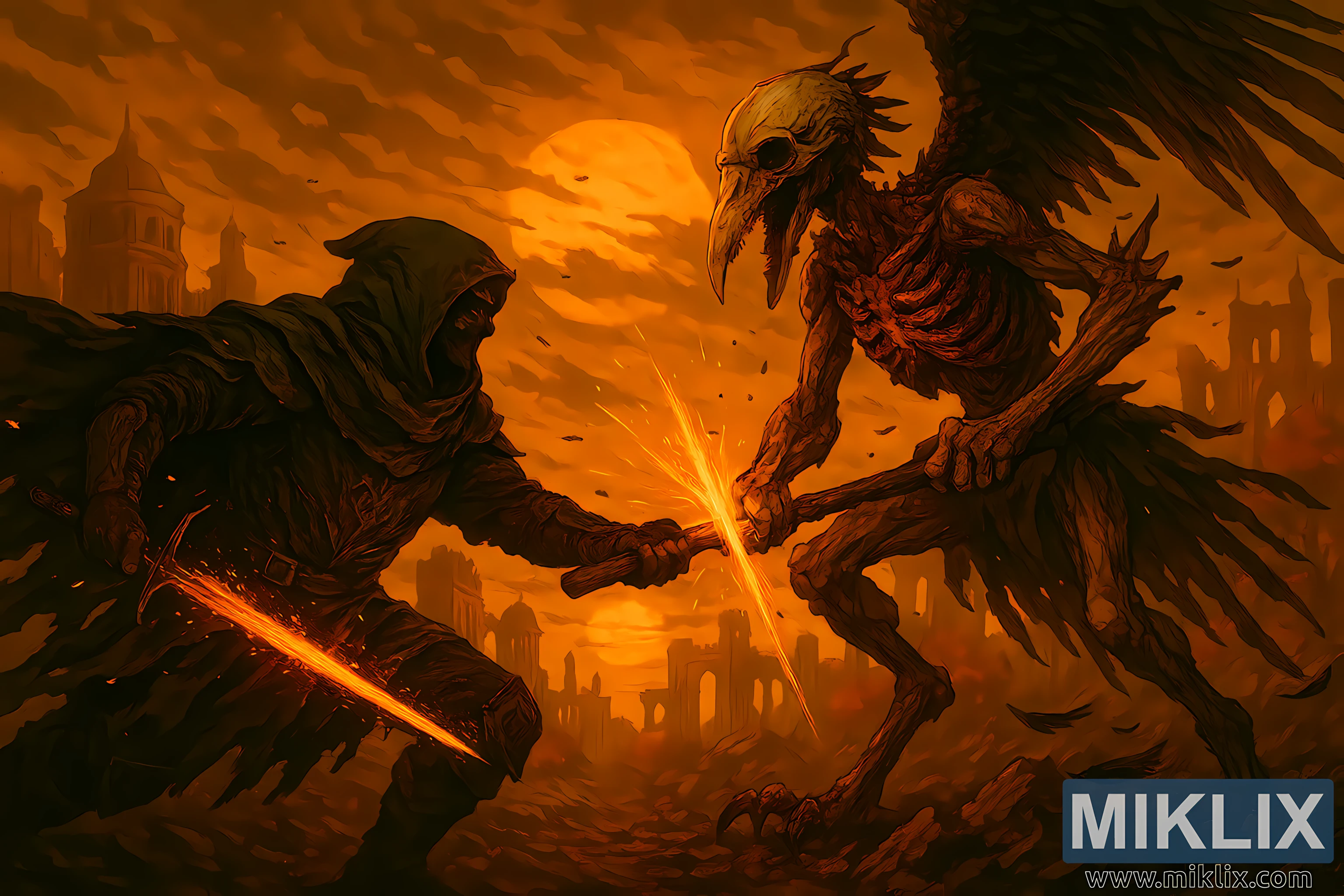 एक हाई-रिज़ॉल्यूशन एनीमे-स्टाइल डिजिटल पेंटिंग में एल्डन रिंग के कैपिटल आउटस्कर्ट्स में टार्निश्ड और एक कंकाल जैसे डेथबर्ड के बीच एक क्लाइमेक्स लड़ाई को कैप्चर किया गया है। यह कंपोज़िशन सिमेट्रिकल और टकराव वाला है, जिसमें दोनों लड़ाके फ्रेम के सेंटर में एक-दूसरे का सामना कर रहे हैं, और एक हिंसक टक्कर के पल में बंद हैं। बाईं ओर मौजूद टार्निश्ड ने आइकॉनिक ब्लैक नाइफ आर्मर पहना हुआ है — यह दांतेदार काली प्लेटों का एक लेयर्ड सेट और एक बहता हुआ, फटा हुआ लबादा है जो उसके हिलने-डुलने के साथ तेज़ी से फैलता है। उसका हुड उसके चेहरे का ज़्यादातर हिस्सा छिपा देता है, जिससे सिर्फ़ उसका पक्का निचला जबड़ा और परछाई के नीचे उसकी आँखों की चमक दिखती है। वह अपने दाहिने हाथ में एक चमकता हुआ खंजर लेकर आगे बढ़ता है, जिसकी ब्लेड से तेज़ नारंगी रोशनी निकलती है और डेथबर्ड के हथियार से टकराते समय अंगारे निकलते हैं।