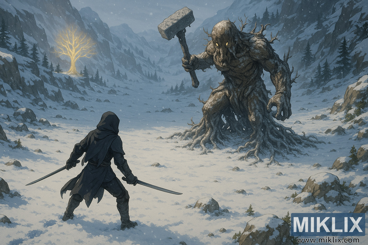 ऊँची जगह से पहले के मुकाबले माहौल का ज़्यादा हिस्सा दिखता है। घाटी चारों तरफ फैली हुई है, बर्फ़ से ढकी हुई है, बस कुछ पत्थर और बर्फ़ से झाँकती छोटी झाड़ियाँ हैं। घाटी के दोनों तरफ़ ऊबड़-खाबड़ चट्टानें हैं, उनके पत्थर के बाहरी हिस्से बर्फ़ से ढके हैं और उन पर गहरे रंग के सदाबहार पेड़ बिखरे हुए हैं। पहाड़ एक पतला गलियारा बनाते हैं जो धीरे-धीरे दूर तक चौड़ा होता जाता है। कंपोज़िशन के बाईं ओर, दूर बैकग्राउंड में, एक चमकता हुआ माइनर एर्डट्री तेज़ी से चमक रहा है, इसकी डालियाँ आग की तरह सुनहरी चमक रही हैं। यह चमक धुंधली हवा में फैलती है, जो नज़ारे पर छाए बर्फीले नीले, भूरे और फीके सफ़ेद रंगों के साथ एक गर्म कंट्रास्ट जोड़ती है। बर्फ़ हल्की-हल्की गिरती रहती है, जिससे नज़ारे की गहराई कम हो जाती है और पूरे नज़ारे में एक ठंडी शांति का एहसास होता है। माहौल के बड़े होने और खुलेपन के बावजूद, देखने वालों की नज़र छोटे योद्धा और बड़े अवतार के बीच की लड़ाई पर जाती है—एक बेरहम, काल्पनिक दुनिया के सामने हिम्मत का एक साफ़ पल।