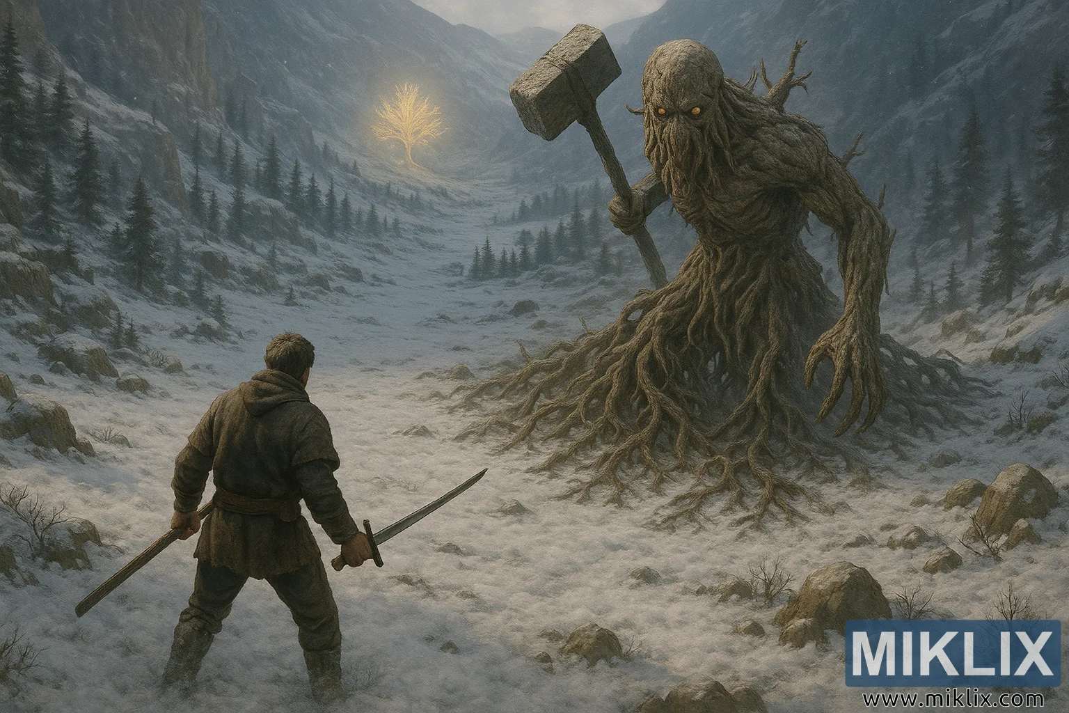 रियलिस्टिक एल्डन रिंग से प्रेरित आर्टवर्क, जिसमें एक दो हथियार चलाने वाला योद्धा बर्फीले पहाड़ी इलाके में एक विशाल एर्डट्री अवतार का सामना कर रहा है।