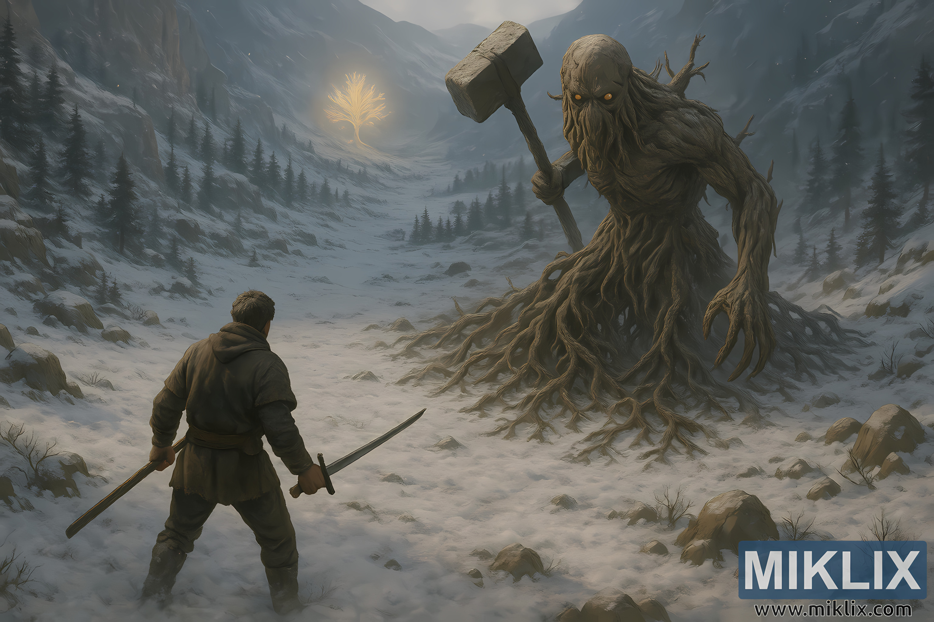 योद्धा के सामने एर्डट्री अवतार खड़ा है, जिसे अब ज़बरदस्त असलियत और मौजूदगी के साथ दिखाया गया है। यह जीव एक बहुत बड़ी जड़ से निकलता है जो बर्फीली ज़मीन पर पुराने पेड़ों की तरह फैली हुई है। इसका धड़ परतों वाली, छाल जैसी मांसपेशियों से बना है, जो सदियों की तेज़ हवा की वजह से खराब और फटी हुई है। इसके दोनों तरफ से दो भारी हाथ निकले हुए हैं, एक हाथ बर्फ पर घसीटता हुआ एक बड़ा हाथ है, जबकि दूसरा एक बहुत बड़ा पत्थर का हथौड़ा उठाए हुए है। हथौड़ा बहुत भारी लगता है—एक असली पत्थर का टुकड़ा जो एक मोटे लकड़ी के हैंडल से बंधा है, जिस पर बर्फ और मिट्टी जमी हुई है। अवतार का सिर एक गांठदार ठूंठ जैसा है, जिसमें लकड़ी और जड़ की लकीरों के नीचे चमकती हुई एम्बर-गोल्ड आँखें जल रही हैं। इसकी पीठ और कंधों से टहनियों जैसे उभार मुड़ते हैं, जिससे एक ऐसा सिल्हूट बनता है जो पेड़ और टाइटन दोनों का है।