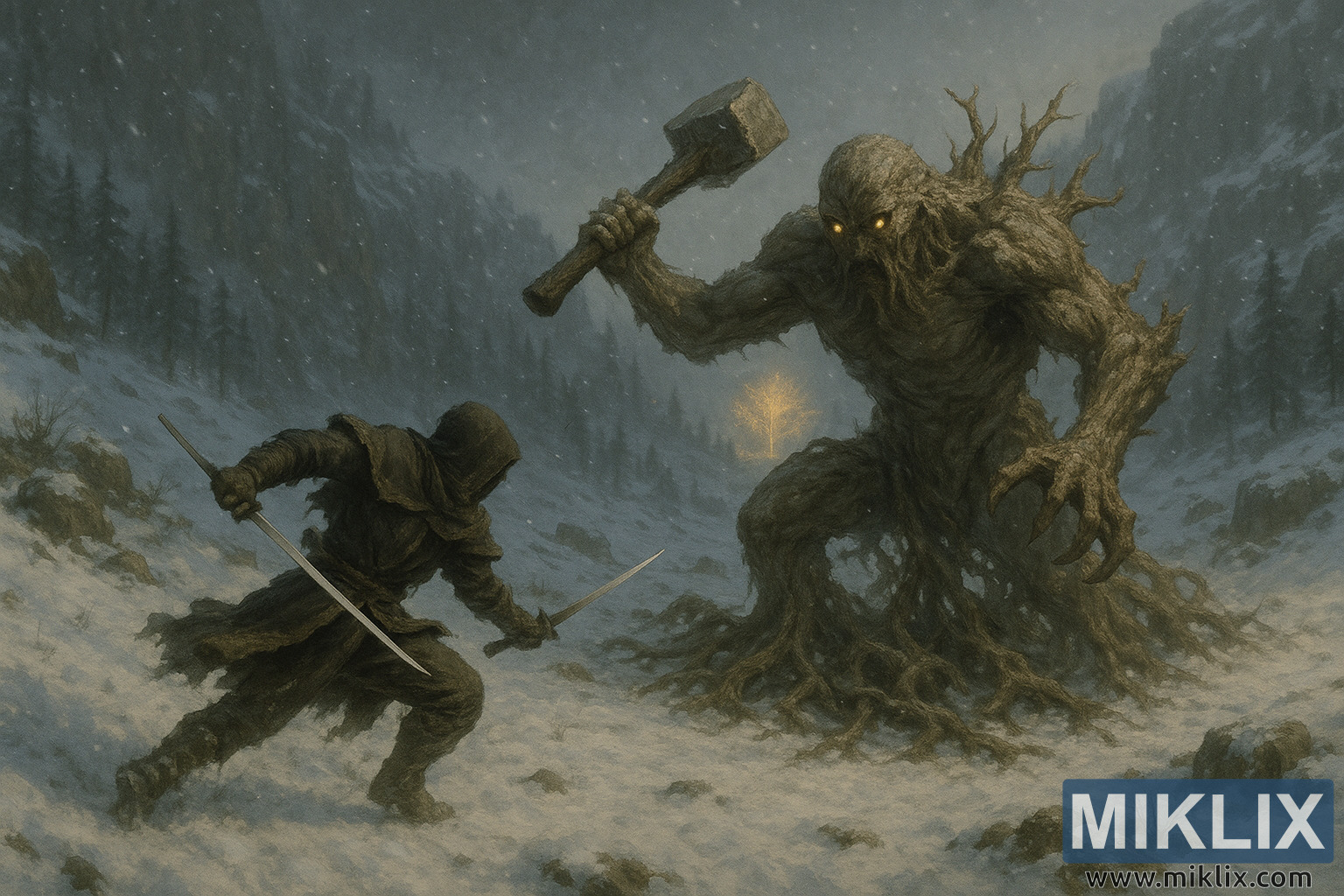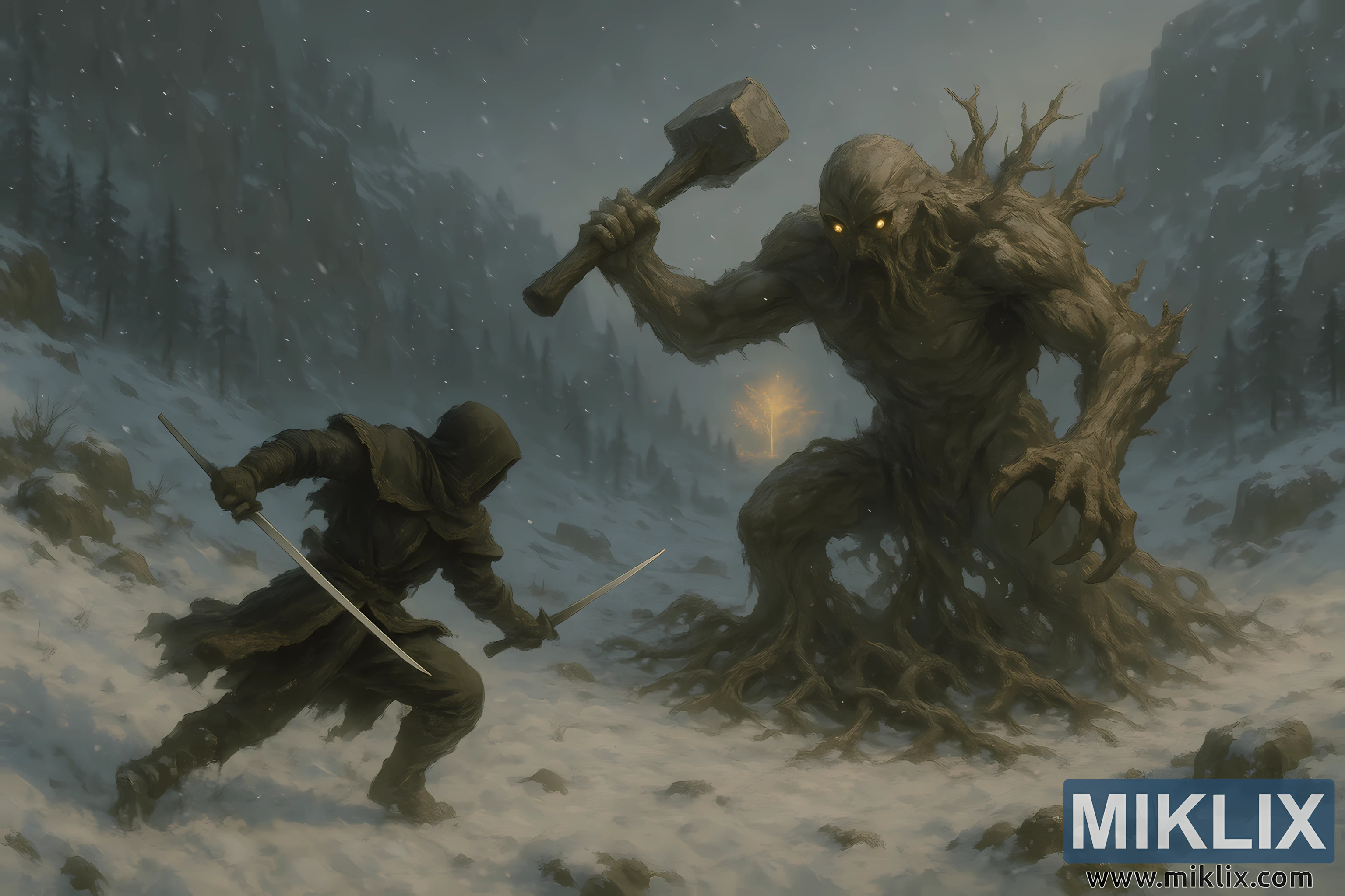 उनके सामने, एर्डट्री अवतार बीच में ही आगे की ओर झपटा, उसका बहुत बड़ा पत्थर का हथौड़ा सिर के ऊपर इतना ऊँचा उठा हुआ था कि टकराने पर ज़मीन के टुकड़े हो गए। अवतार की लकड़ी की मांसपेशियां हिलने-डुलने के साथ झुकती और खिंचती हैं, उसके छाल जैसे टेंडन अजीब तरह से मुड़ते हैं जब वह अपने दुश्मन पर दबाव डालता है। उलझी हुई जड़ जैसी टांगें बर्फ में धंस जाती हैं, जिससे बर्फीली गंदगी ऊपर उठती है। उस जीव की चमकती हुई अंबर आँखें तेज़ी से जलती हैं, योद्धा पर दिव्य, बिना भाव के ध्यान से टिकी हुई हैं। उसकी पीठ से नुकीली डालियाँ एक मुड़े हुए प्रभामंडल की तरह निकली हुई हैं, जो तूफान से काले आसमान में एक परछाई की तरह दिख रही हैं।