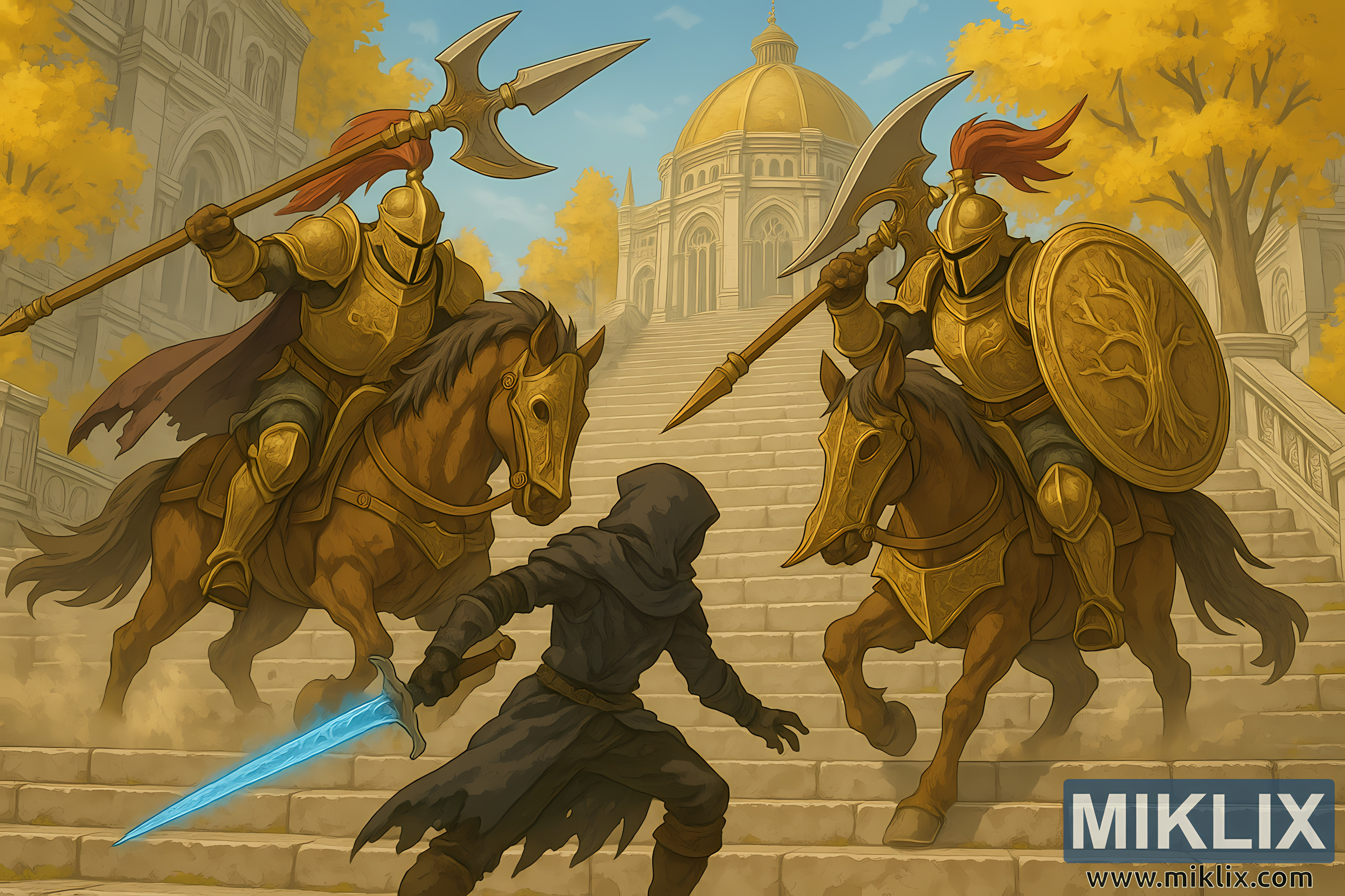 यह इलस्ट्रेशन ऑल्टस पठार में रॉयल कैपिटल, लेयंडेल की ओर जाने वाली बड़ी पत्थर की सीढ़ियों पर सेट एक ड्रामाटिक, एनीमे से प्रेरित लड़ाई का सीन दिखाता है। पतझड़ की रोशनी सीढ़ियों के किनारे लगे चमकीले सुनहरे पेड़ों से होकर आती है, उनके पत्ते सीन के चारों ओर बिखर जाते हैं और दो बख्तरबंद घोड़ों के खुरों से धूल और मलबा उड़ता है। कंपोज़िशन के सेंटर में टार्निश्ड खड़े हैं, जिन्होंने काले, फटे-पुराने लेकिन सुंदर ब्लैक नाइफ आर्मर पहना हुआ है। उनका पोस्चर नीचे और मज़बूत है, एक पैर आगे और एक पीछे, क्योंकि वे एक चमकती हुई स्पेक्ट्रल-नीली तलवार पकड़े हुए हैं जिससे अलौकिक ऊर्जा निकलती है। टार्निश्ड का हुड उनके चेहरे को छुपाता है, जिससे उन्हें एक रहस्यमयी, भूत जैसी मौजूदगी मिलती है जो उनके विरोधियों की सुनहरी चमक के उलट है।