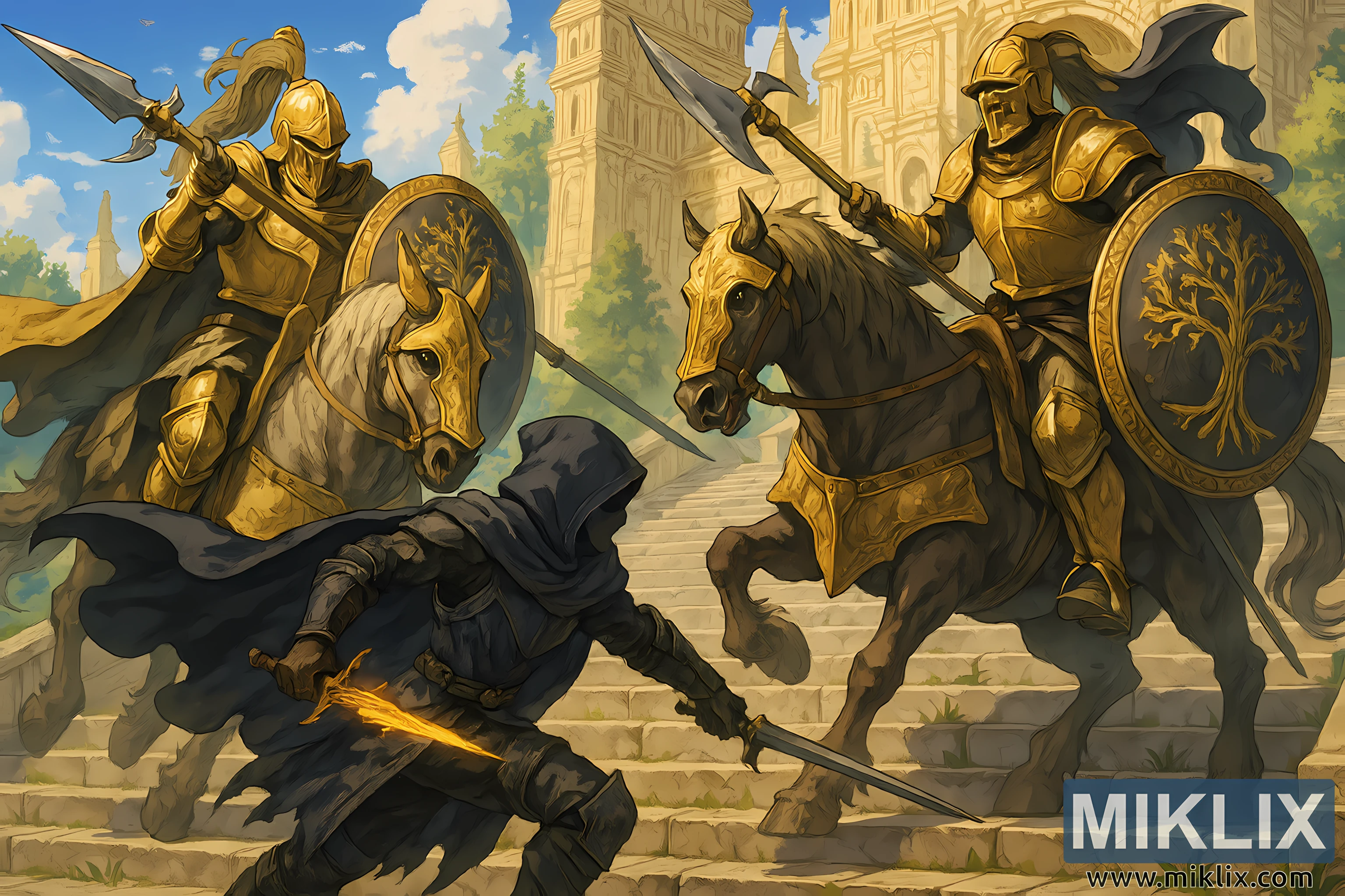 एपिक एनीमे-स्टाइल एल्डन रिंग फैन आर्ट, जिसमें लेयंडेल के गेट पर ट्री सेंटिनल्स से लड़ते हुए ब्लैक नाइफ आर्मर में टार्निश्ड दिखाया गया है।