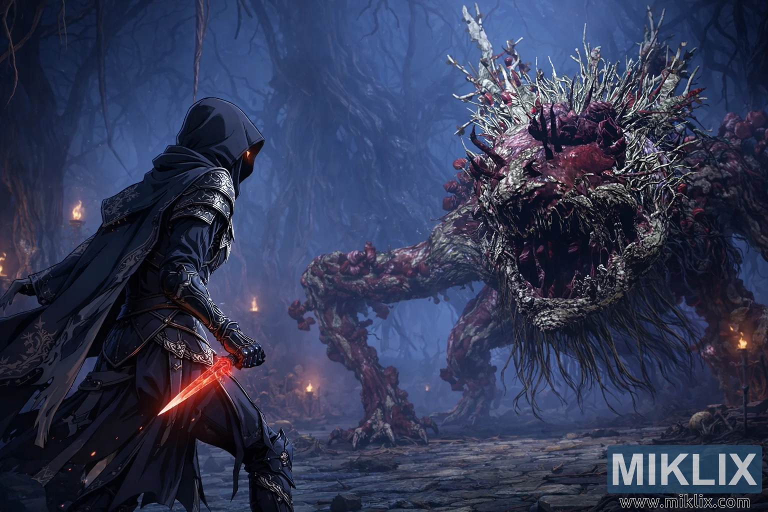 टार्निश्ड के सामने अल्सरेटेड ट्री स्पिरिट है, जो कंपोज़िशन के दाहिने हिस्से पर हावी है। बॉस बहुत बड़ा और अजीब है, उसका रूप सड़ी हुई लकड़ी, खुले मांस और ऐंठती हुई नसों का एक अजीब मेल है। उसका शरीर पत्थर के फ़र्श पर ऐसे फैला हुआ है जैसे किसी खराब जड़ सिस्टम को जान मिल गई हो। उसकी पीठ और सिर से दांतेदार, टहनी जैसे उभार निकलते हैं, कुछ पीले और हड्डी जैसे, तो कुछ काले और टूटे हुए। फटी हुई छाल के नीचे कच्चे, लाल मांस के धब्बे धड़कते हैं, जो एक ज़िंदा ज़ख्म का एहसास देते हैं। उस जीव का खुला हुआ मुंह टार्निश्ड की ओर खुलता है, जिस पर ऊबड़-खाबड़, नुकीले दांत जैसे उभार हैं, फिर भी वह अभी तक झपटा नहीं है। इसके बजाय, वह कुंडलित और तना हुआ दिखता है, जैसे किसी ज़रूरी हमले से पहले सांस ले रहा हो।