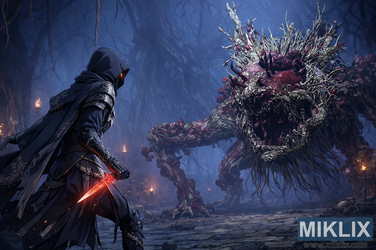 कुल मिलाकर, यह इमेज एक्शन के बजाय सस्पेंस दिखाती है। अभी तक स्टील की टक्कर या ज़बरदस्त जादू नहीं है—सिर्फ़ हिंसा से पहले की भारी शांति है। यह डर और पक्के इरादे की खास एल्डन रिंग वाली फीलिंग को दिखाता है: एक अकेला टार्निश्ड एक बहुत बड़े, बुरे सपने जैसे दुश्मन के सामने खड़ा है, जिसका नतीजा पक्का नहीं है और हवा में आने वाला खतरा भरा है।