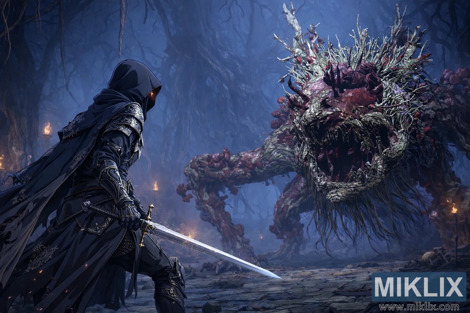 सामने, बाईं ओर, टार्निश्ड खड़े हैं। पीछे से और थोड़ा प्रोफ़ाइल में देखने पर, उनका शरीर ब्लैक नाइफ़ आर्मर सेट में लिपटा हुआ है, जिस पर चिकने कंटूर और सजावटी सिल्वर नक्काशी है। आर्मर के गहरे, हल्के रंग आस-पास की ज़्यादातर रोशनी सोख लेते हैं, जिससे टार्निश्ड की परछाई जैसी, हत्यारे जैसी मौजूदगी और बढ़ जाती है। उनके सिर पर एक हुड है, जो चेहरे के फीचर्स को छिपाता है और उनकी पहचान को और पक्का करता है, जबकि आर्मर के किनारों पर हल्की हाइलाइट्स घिसे हुए मेटल और अनगिनत पिछली लड़ाइयों का इशारा करती हैं। टार्निश्ड अपने दाहिने हाथ में एक सीधी तलवार पकड़े हुए हैं, ब्लेड नीचे की ओर झुका हुआ है लेकिन तैयार है, इसकी पॉलिश की हुई सतह हल्की टॉर्च की रोशनी को पकड़ रही है। उनका रुख नपा-तुला और सोचा-समझा है—घुटने मुड़े हुए, कंधे सीधे, वज़न बैलेंस्ड—बिना किसी गुस्से के तैयारी दिखा रहा है, जैसे कि टार्निश्ड हमला करने से पहले ज़रा से उकसावे का इंतज़ार कर रहा हो।