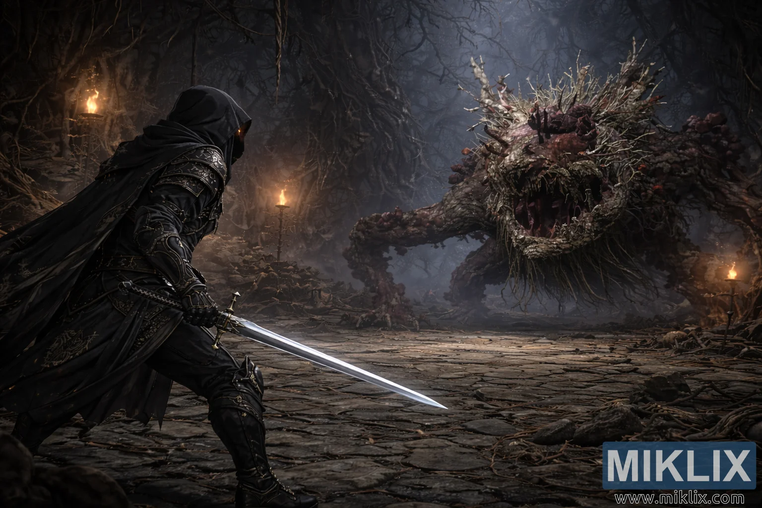 सामने, टार्निश्ड छोटे लेकिन पक्के इरादे वाले दिखते हैं। उन्होंने ब्लैक नाइफ आर्मर सेट पहना है, जिसे असली जैसे मटीरियल और हल्के कंट्रास्ट से दिखाया गया है। यह आर्मर गहरे रंग की मेटल प्लेट और लेदर से बना है, जिस पर बारीक सिल्वर डिटेलिंग की गई है जो सिर्फ़ कुछ खास एंगल से ही रोशनी पकड़ती है। इसकी सतह पर घिसाव और उम्र दिखती है, जिससे लगता है कि यह किसी खास तरह के दिखावे के बजाय लंबे समय से इस्तेमाल किया गया है। टार्निश्ड के सिर पर एक भारी हुड है, जिससे उनका चेहरा पूरी तरह छिप जाता है और उनकी पहचान साफ़ नहीं हो पाती। उनका पोस्चर नीचे और सोच-समझकर बनाया गया है, घुटने मुड़े हुए और कंधे सीधे हैं, जो बहादुरी के बजाय सावधानी दिखाते हैं। अपने दाहिने हाथ में, वे एक सीधी तलवार पकड़े हुए हैं, जिसका ब्लेड नीचे की ओर लेकिन आगे की ओर झुका हुआ है, जो एक पल में उठने के लिए तैयार है। स्टील से टॉर्च की रोशनी हल्की, चांदी जैसी चमक में दिखती है, जो सीन के असलीपन को और पक्का करती है।