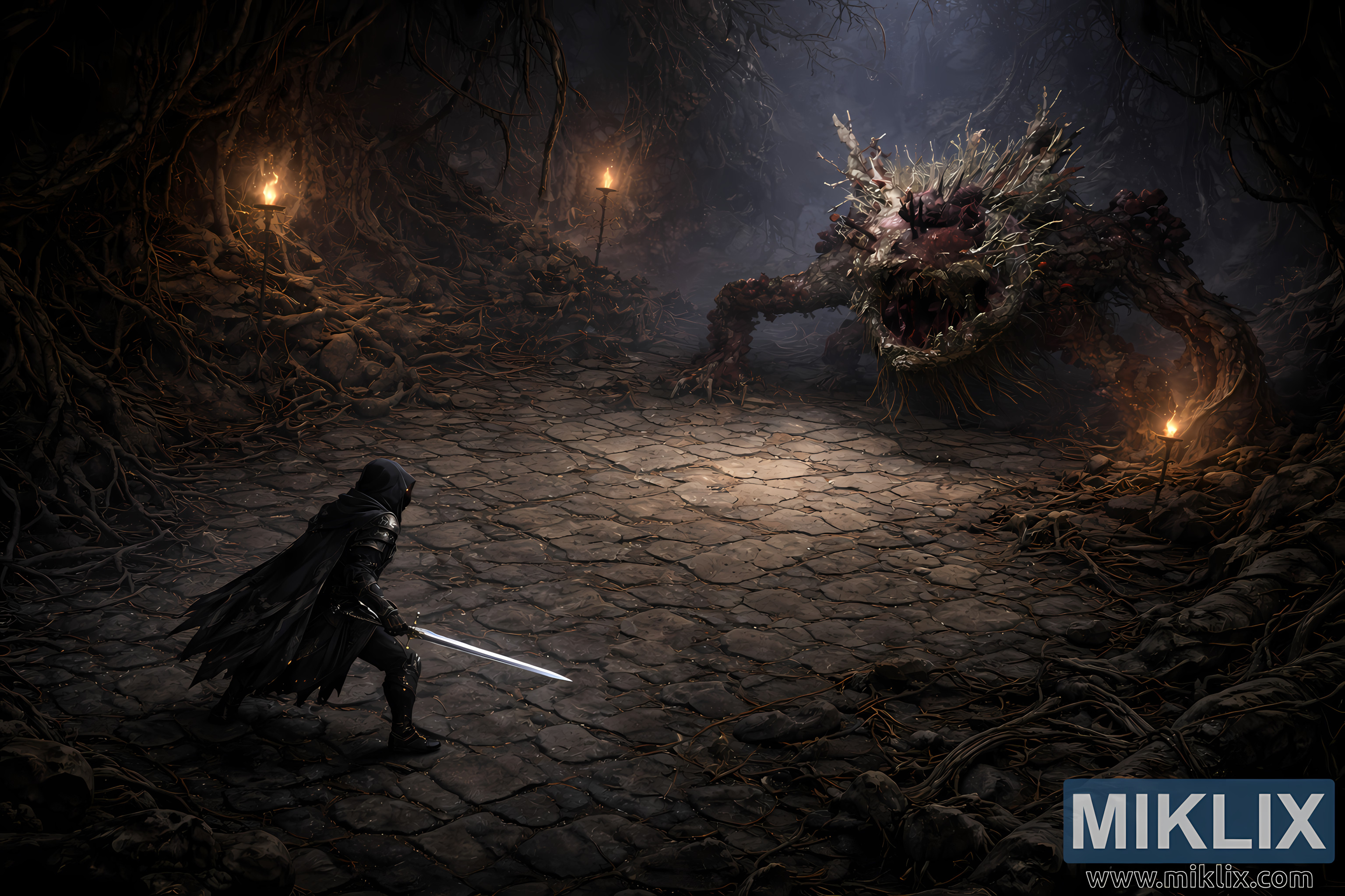 अंडरग्राउंड कमरा गोल और बंद है, इसकी सीमाएं दीवारों और छत से नीचे फैली पेड़ों की बड़ी-बड़ी, उलझी हुई जड़ों से तय होती हैं। ये जड़ें एक पत्थर के जंगल की तरह अंदर की ओर फैली हुई हैं, जो पत्थर के फर्श के चारों ओर एक घुटन भरा घेरा बनाती हैं। ज़मीन खुद ऊबड़-खाबड़, टूटी हुई पत्थर की टाइलों से बनी है, जो कहीं चिकनी हो गई हैं और कहीं टूटी हुई हैं, और दरारों के बीच रेंगती हुई जड़ें फैली हुई हैं। एक हल्की, नीली-ग्रे धुंध पूरे मैदान को ढक लेती है, जो दूर की डिटेल्स को हल्का कर देती है और जगह को एक ठंडा, ठहरा हुआ माहौल देती है।