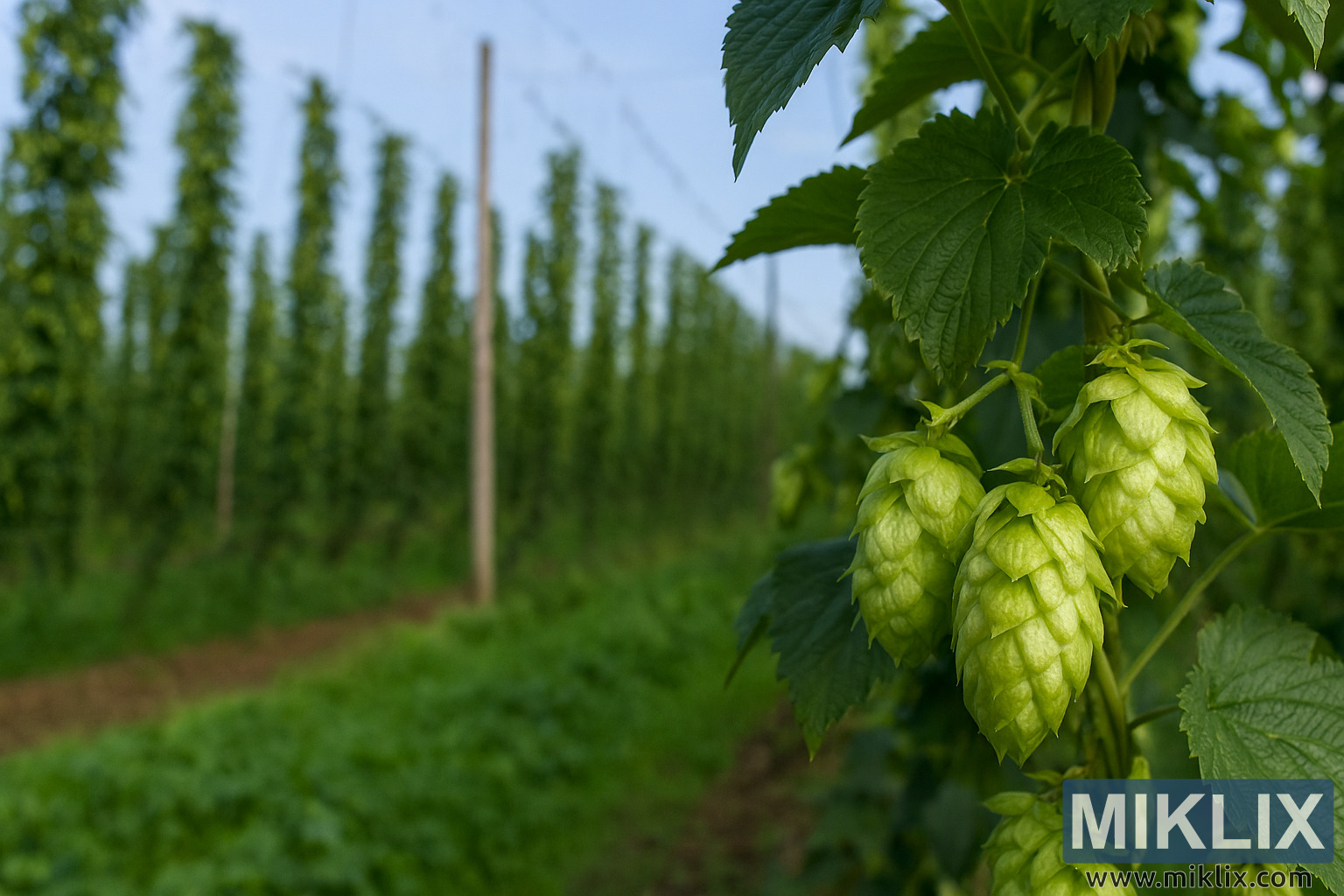 बीच की ज़मीन में, हॉप की बेलों की लाइनें लकड़ी के खंभों और तनी हुई आड़ी तारों से बनी जाली के जाल पर सीधी चढ़ती हैं। ये जाली खेत में एक जैसी लाइनों में फैली हुई हैं, जिससे गहराई का एहसास होता है और देखने वाले की नज़र क्षितिज की ओर जाती है। बेलें घनी पत्तियों और हॉप कोन से ढकी हुई हैं, जिससे एक हरा-भरा गलियारा बनता है। जाली के नीचे की मिट्टी हल्के भूरे रंग की और जुताई की हुई है, जिसमें लाइनों के बीच घास और खरपतवार के धब्बे हैं, जो एक अच्छी तरह से मेंटेन की गई लेकिन प्राकृतिक खेती की जगह दिखाते हैं।
