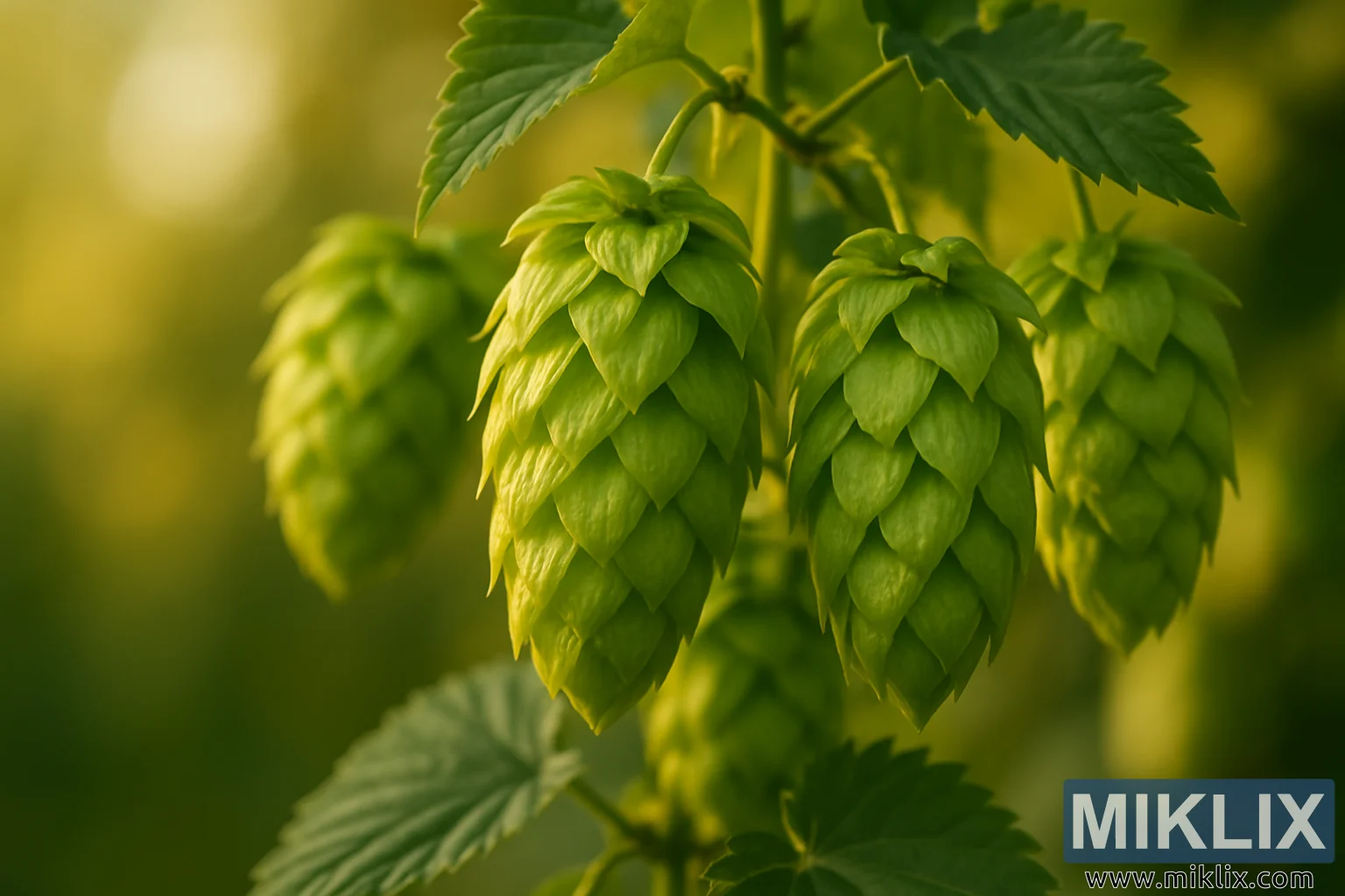बैकग्राउंड में, सीन एक स्मूद, हल्के धुंधले बोकेह में बदल जाता है जिसमें गोल्डन टोन और हल्के हरे रंग होते हैं। यह फैला हुआ बैकग्राउंड हॉप कोन को सेंट्रल सब्जेक्ट के तौर पर अलग करता है, जिससे वे शार्प फोकस में अलग दिखते हैं। कम डेप्थ ऑफ़ फ़ील्ड न सिर्फ़ एस्थेटिक अपील को बढ़ाता है बल्कि अपनेपन का एहसास भी बढ़ाता है—जैसे देखने वाला पौधे से बस कुछ इंच की दूरी पर हो।