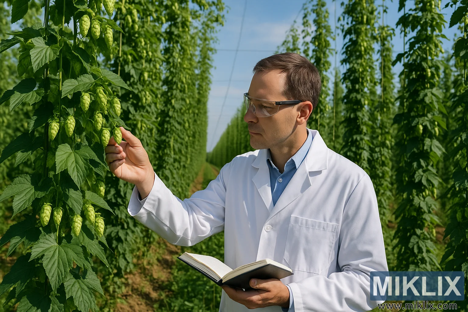 सफेद लैब कोट पहने एक साइंटिस्ट, एक हरे-भरे हॉप के खेत में हॉप कोन को ध्यान से देख रहा है, और एग्रीकल्चरल रिसर्च के लिए ऑब्ज़र्वेशन रिकॉर्ड कर रहा है।