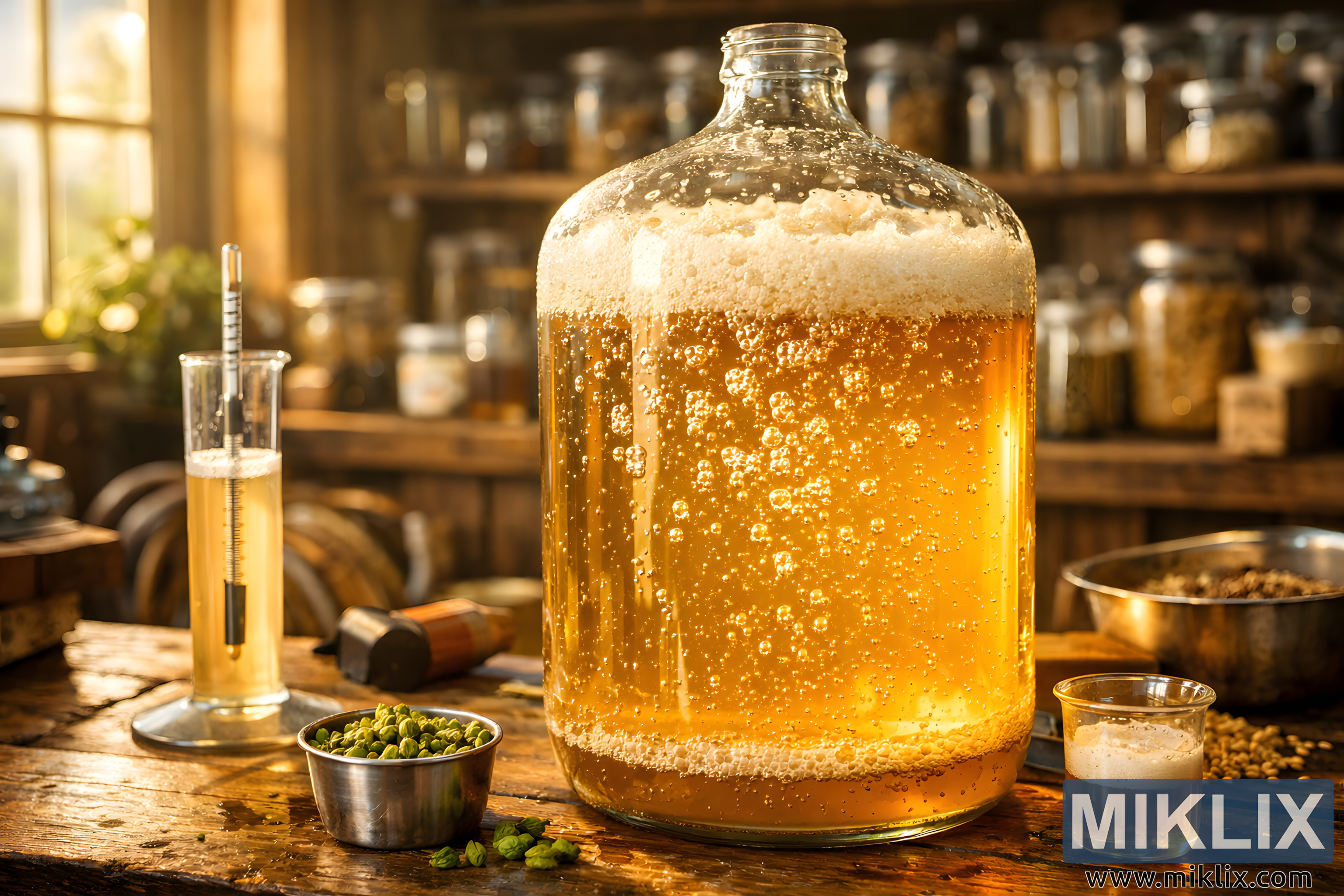 यह इमेज एक बहुत ध्यान से बनाया गया, लैंडस्केप वाला सीन दिखाती है जो ब्रूइंग प्रोसेस में क्राफ्ट और साइंस के मेल को दिखाता है। फ्रेम के बीच में एक बड़ा, साफ़ कांच का फर्मेंटेशन वेसल है जो एक ठोस, पुरानी लकड़ी की टेबल पर रखा है। वेसल लगभग कंधे तक हल्के सुनहरे लिक्विड से भरा है, जो चमकदार और ट्रांसलूसेंट है, जिससे पता चलता है कि बीयर का फर्मेंटेशन अच्छी तरह हो गया है, जो देखने में लगभग बहत्तर से अठहत्तर परसेंट की रेंज में कमी के साथ मेल खाता है। लिक्विड की निचली गहराई से अनगिनत छोटे बुलबुले लगातार सतह की ओर उठते हैं, जहाँ वे एक हल्के टेक्सचर वाली, ऑफ-व्हाइट फोम लेयर में इकट्ठा हो जाते हैं। यह फोम धीरे से अंदर के कांच से चिपक जाता है, जिससे अजीब पैटर्न बनते हैं जो एक्टिव यीस्ट मेटाबॉलिज्म और चल रहे बदलाव का इशारा करते हैं। कांच खुद लाइट को पकड़ता है, जिससे हल्की हाइलाइट्स और रिफ्लेक्शन बनते हैं जो वेसल के घुमाव और अंदर की ब्रू की क्लैरिटी को और उभारते हैं। सामने, टेबल की सतह पर बहुत डिटेलिंग है, जिसमें दाने, छोटी खरोंचें और हल्के भूरे रंग के निशान दिख रहे हैं, जो बार-बार इस्तेमाल होने का इशारा करते हैं। पास में ही ब्रूइंग के ज़रूरी टूल रखे हैं: एक लंबा, ट्रांसपेरेंट हाइड्रोमीटर जो उसी सुनहरे लिक्विड से भरे एक पतले मापने वाले सिलेंडर में थोड़ा डूबा हुआ है, जिसका स्केल हल्का सा दिख रहा है; हरे हॉप पेलेट्स वाला एक छोटा मेटल का कटोरा; और बिखरे हुए दाने जो टेक्सचर और कॉन्टेक्स्ट जोड़ते हैं। इन चीज़ों को आराम से लेकिन जानबूझकर लगाया गया है, जो ब्रूइंग के काम के नेचर को और मज़बूत करता है। बीच का हिस्सा एकदम फोकस बनाए रखता है, जिससे देखने वाला फर्मेंटर और उसके सपोर्टिंग टूल के बीच के रिश्ते को समझ पाता है, जबकि बैकग्राउंड धीरे-धीरे धुंधला हो जाता है। जगह के पीछे शेल्फ हैं, जिनमें जार, कंटेनर और ब्रूइंग का सामान रखा है, जिनके आकार और रंग पहचाने जा सकते हैं लेकिन ध्यान भटकाने वाले नहीं हैं। यह कम गहराई वाला फील्ड अपनेपन का एहसास कराता है, जैसे देखने वाला किसी प्राइवेट वर्कशॉप या होम ब्रूअरी में आ गया हो। बाईं ओर से, शायद पास की खिड़की से, दोपहर की गर्म रोशनी अंदर आती है, जो पूरे सीन को सुनहरे रंगों में नहला देती है। लाइट बीयर का रंग निखारती है, लकड़ी के टोन को बेहतर बनाती है, और सॉफ्ट, नेचुरल शैडो बनाती है जो बिना किसी तेज़ कंट्रास्ट के गहराई देती है। कुल मिलाकर, माहौल शांत, फोकस्ड और आकर्षक है, जो सब्र, सटीकता और शांत संतुष्टि दिखाता है। यह इमेज सिर्फ़ फर्मेंटेशन को ही नहीं दिखाती; यह ब्रूइंग के सेंसरी अनुभव, बुदबुदाते लिक्विड की हल्की आवाज़, अनाज और हॉप्स की मिट्टी जैसी खुशबू, और ब्रूअर का ध्यान से ध्यान दे