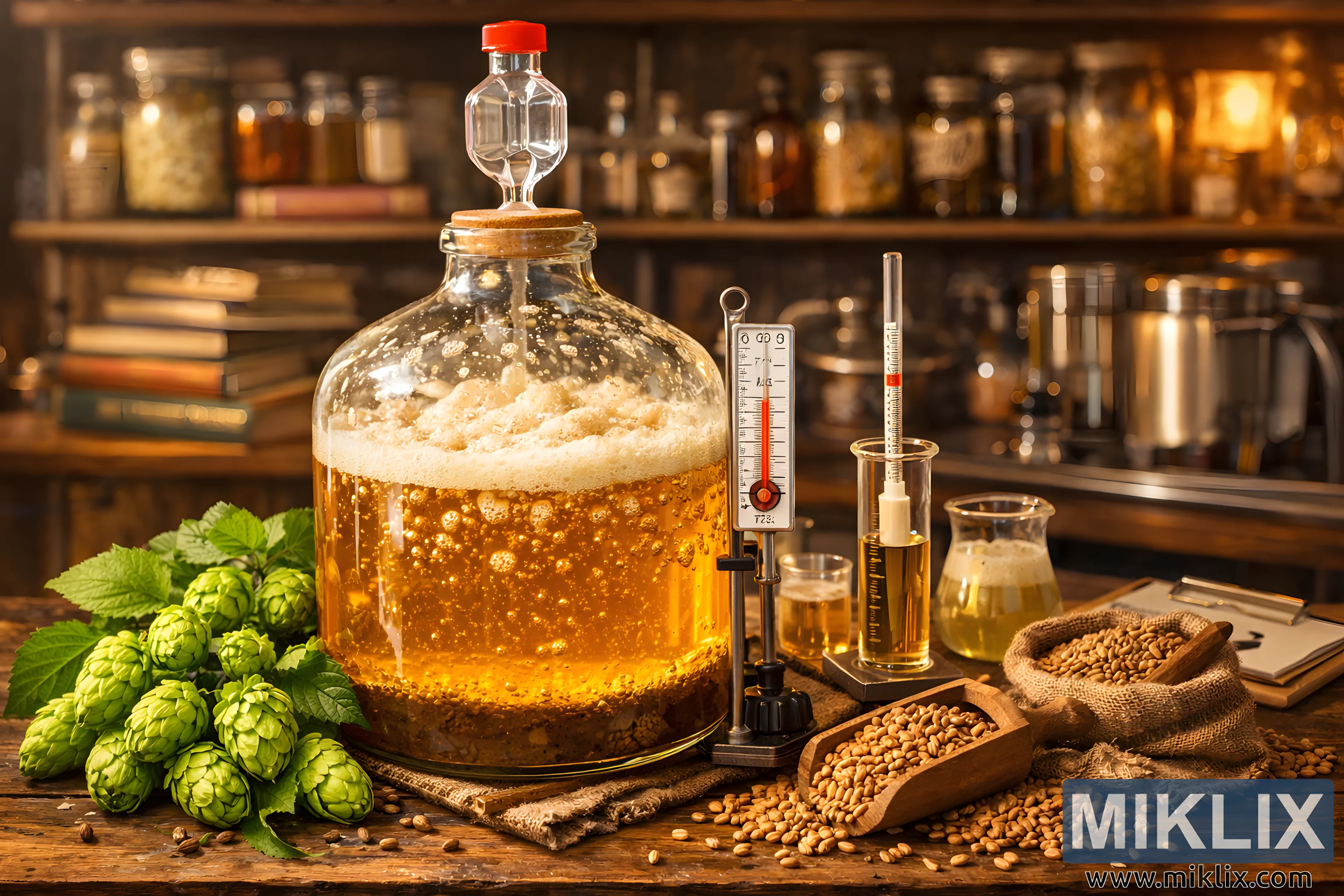 बैकग्राउंड धीरे-धीरे सॉफ्ट फोकस में बदल जाता है, जिससे लकड़ी की शेल्फ दिखती हैं जिन पर इंग्रीडिएंट्स के जार, ब्रूइंग टूल्स और पुरानी ब्रूइंग बुक्स रखी हैं। यह कम डेप्थ ऑफ़ फील्ड कहानी में गहराई और कॉन्टेक्स्ट जोड़ते हुए फर्मेंटेशन प्रोसेस पर ध्यान बनाए रखती है। गर्म, एम्बर-टोन वाली लाइटिंग पूरे सीन को नहला देती है, कांच और मेटल पर सॉफ्ट हाइलाइट्स डालती है और एक आरामदायक, इनवाइटिंग माहौल बनाती है। लाइटिंग से सब्र, देखभाल और शांत कॉन्सेंट्रेशन का एहसास होता है, जैसे कि ब्रूअर कुछ देर के लिए दूर चला गया हो, और यीस्ट को अपना काम करने के लिए छोड़ दिया हो।