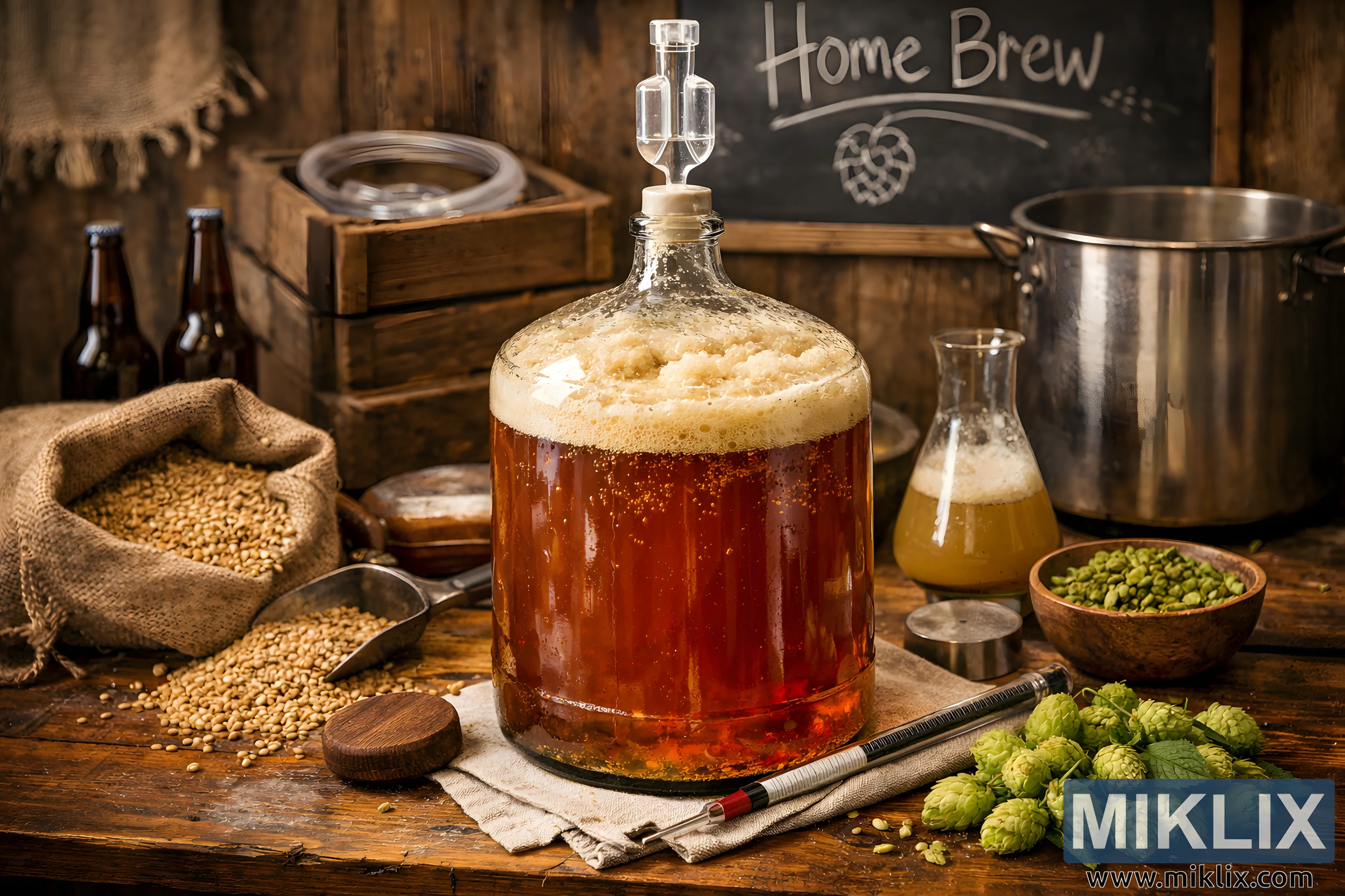 एक डिटेल्ड रस्टिक होमब्रूइंग सीन जिसमें लकड़ी की टेबल पर फ़र्मेंट हो रही अमेरिकन एल का ग्लास कारबॉय है, साथ में हॉप्स, माल्ट, बोतलें और ब्रूइंग इक्विपमेंट भी हैं, और हल्की रोशनी में।