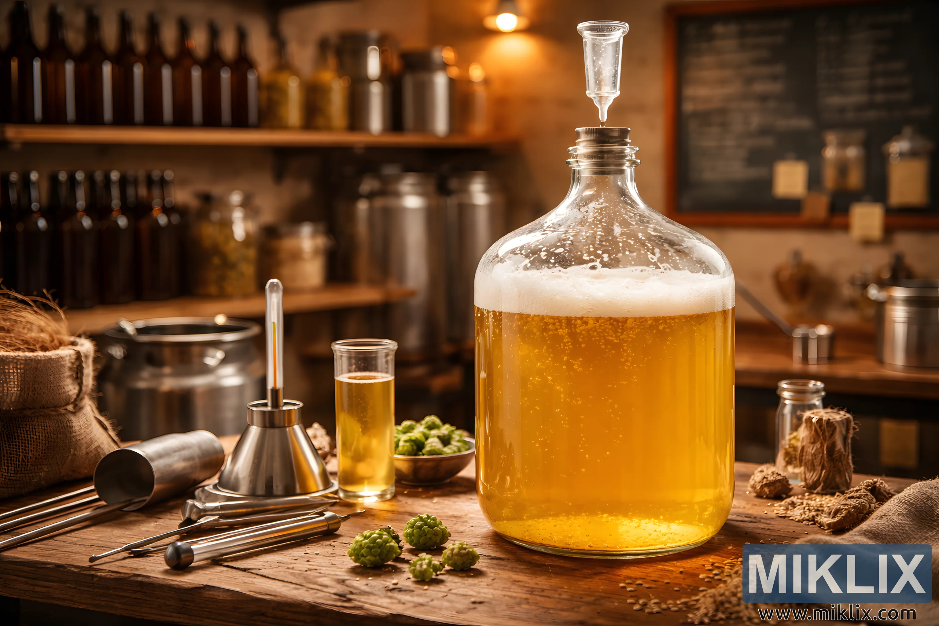 एक प्रोफेशनल बीयर कंडीशनिंग सेटअप की हाई-रिज़ॉल्यूशन इमेज, जिसमें गर्म रोशनी में फ़र्मेंट हो रहा ग्लास कारबॉय, ब्रूइंग टूल्स, हॉप्स और बोतलों की शेल्फ़ हैं।