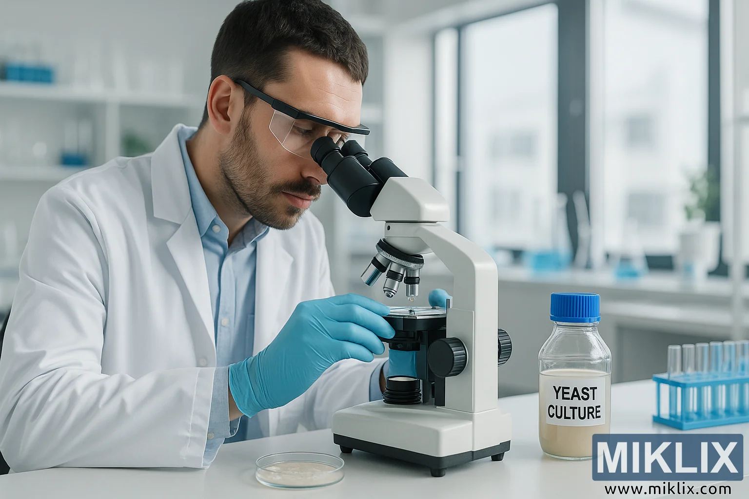 इस तस्वीर में एक साइंटिस्ट को एक चमकदार, मॉडर्न लैब में काम करते हुए दिखाया गया है, जो माइक्रोस्कोप के नीचे यीस्ट कल्चर की जांच कर रहा है। उसने सफेद लैब कोट, हल्के नीले रंग की शर्ट और प्रोटेक्टिव आईवियर पहना हुआ है, साथ में नीले नाइट्राइल ग्लव्स पहने हैं जो स्टेरिलिटी और सटीकता दिखाते हैं। उसका पोस्चर ध्यान से और स्थिर है, वह माइक्रोस्कोप की तरफ थोड़ा झुका हुआ है और एक हाथ से स्टेज को एडजस्ट कर रहा है और दूसरे हाथ से स्लाइड को स्टेबल कर रहा है। उसके आस-पास की लैब साफ, ऑर्गनाइज़्ड और बड़ी है, जिसमें सफेद काउंटरटॉप और शेल्फ हैं जिनमें बीकर, फ्लास्क और टेस्ट ट्यूब जैसे साइंटिफिक ग्लासवेयर के अलग-अलग पीस रखे हैं। बैकग्राउंड में बड़ी खिड़कियों से नेचुरल लाइट आती है, जो वर्कस्पेस को रोशन करती है और कमरे को हवादार, क्लिनिकल फील देती है।