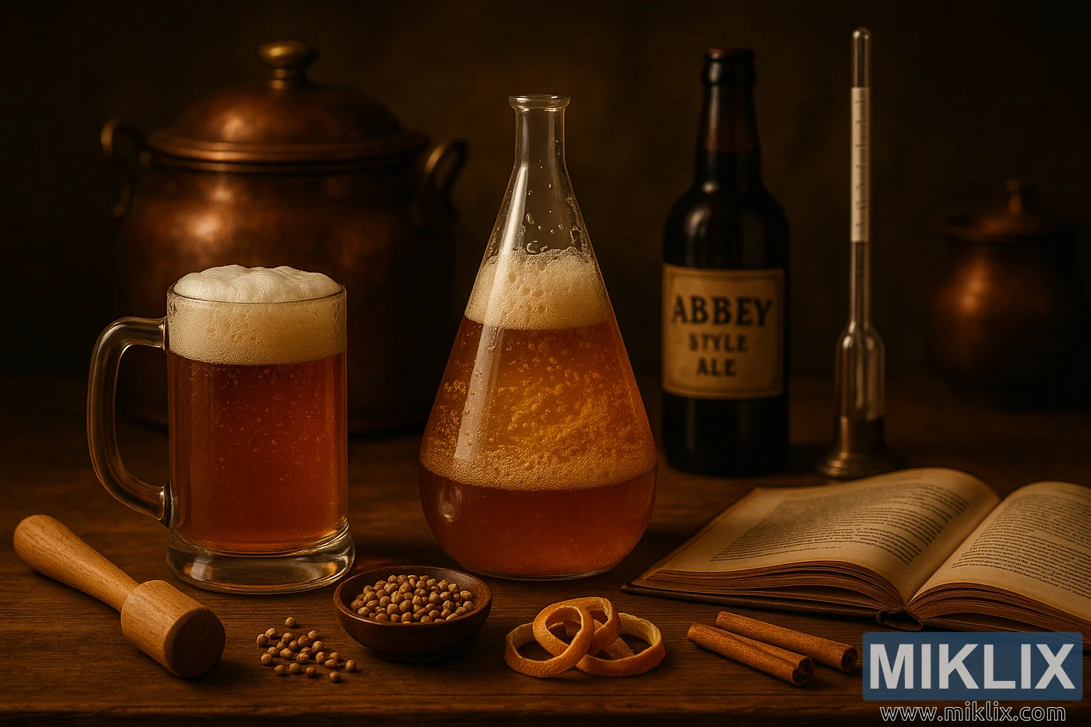 एक गर्म, देहाती स्थिर जीवन जिसमें झागदार एम्बर बियर, शराब बनाने के मसाले, खमीर फ्लास्क, नुस्खा पुस्तक और तांबे के बर्तन शामिल हैं, जो बेल्जियम शराब बनाने की परंपरा को याद दिलाते हैं।