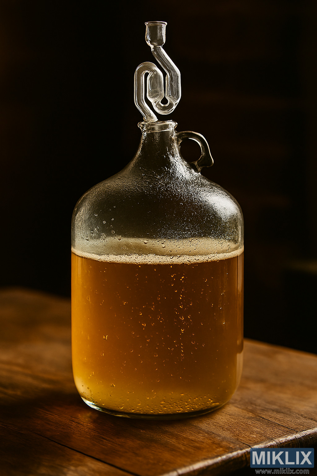 एक देहाती लकड़ी की मेज पर सुनहरे ब्रिटिश एले से भरा एक ग्लास कारबॉय धीरे-धीरे बुदबुदाता है, जिसमें एक पारंपरिक शराब बनाने की व्यवस्था में एक स्पष्ट एस-आकार का एयरलॉक और गर्म प्राकृतिक प्रकाश व्यवस्था है।