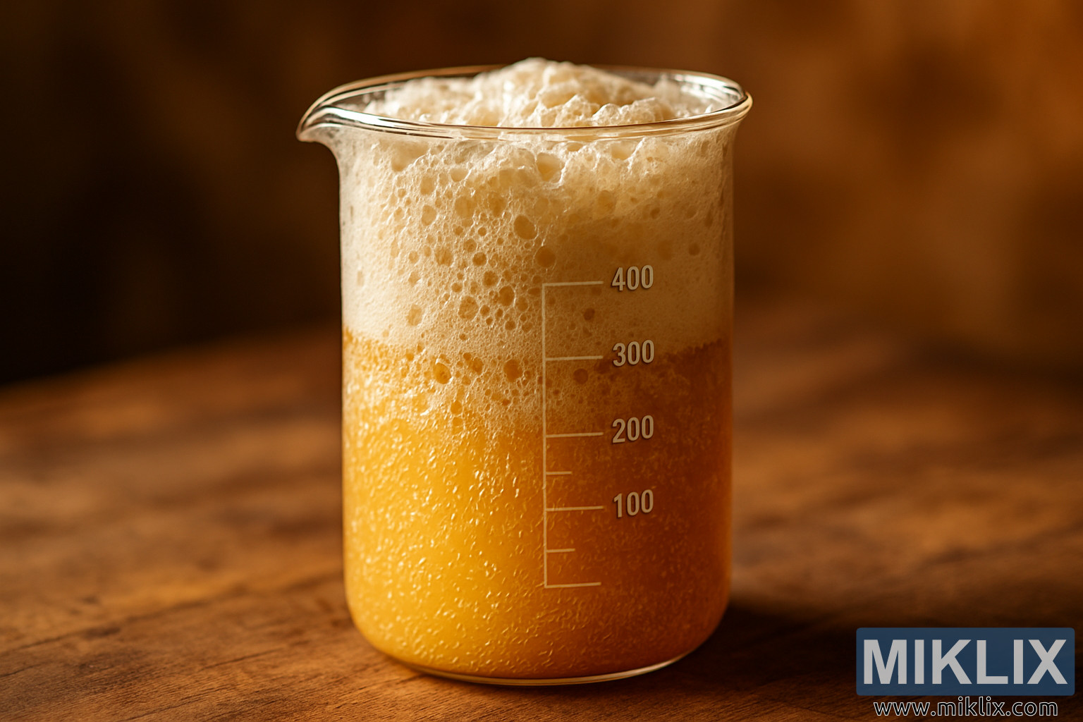यह इमेज एक कांच के बीकर का बहुत डिटेल्ड, गर्म रोशनी वाला क्लोज-अप दिखाती है, जिसमें एक्टिवली फर्मेंट हो रहे यीस्ट स्टार्टर भरा हुआ है। बीकर, जिस पर 400 ml तक की मेज़रमेंट लाइन बनी हैं, एक लकड़ी की सतह पर रखा है जिसके दाने और हल्की घिसावट सीन को एक देहाती, छूने लायक क्वालिटी देती है। बर्तन के अंदर का लिक्विड गहरे सुनहरे रंग से चमकता है, यह रंग हल्की, डायरेक्शनल लाइटिंग से और गहरा हो जाता है जो कांच पर सॉफ्ट हाइलाइट्स डालती है और मिक्सचर के अंदर एक नेचुरल ग्रेडिएंट बनाती है। यीस्ट स्टार्टर खुद एक्टिविटी से साफ दिख रहा है: अनगिनत माइक्रोबबल्स बीकर की अंदरूनी सतह से चिपके रहते हैं, घने क्लस्टर बनाते हैं जो लिक्विड के घूमते हुए, ओपेक बॉडी में फीके पड़ जाते हैं। ऊपर, बीकर के किनारे से हल्के, हवादार फोम की एक मोटी टोपी ऊपर उठती है, इसका टेक्सचर व्हीप्ड क्रीम या ताज़ी डाली गई बीयर हेड की याद दिलाता है। फोम की सतह छोटे-छोटे क्रेटर और चोटियों के साथ ऊपर-नीचे होती है, जिससे चल रहे फर्मेंटेशन का साफ एहसास होता है।