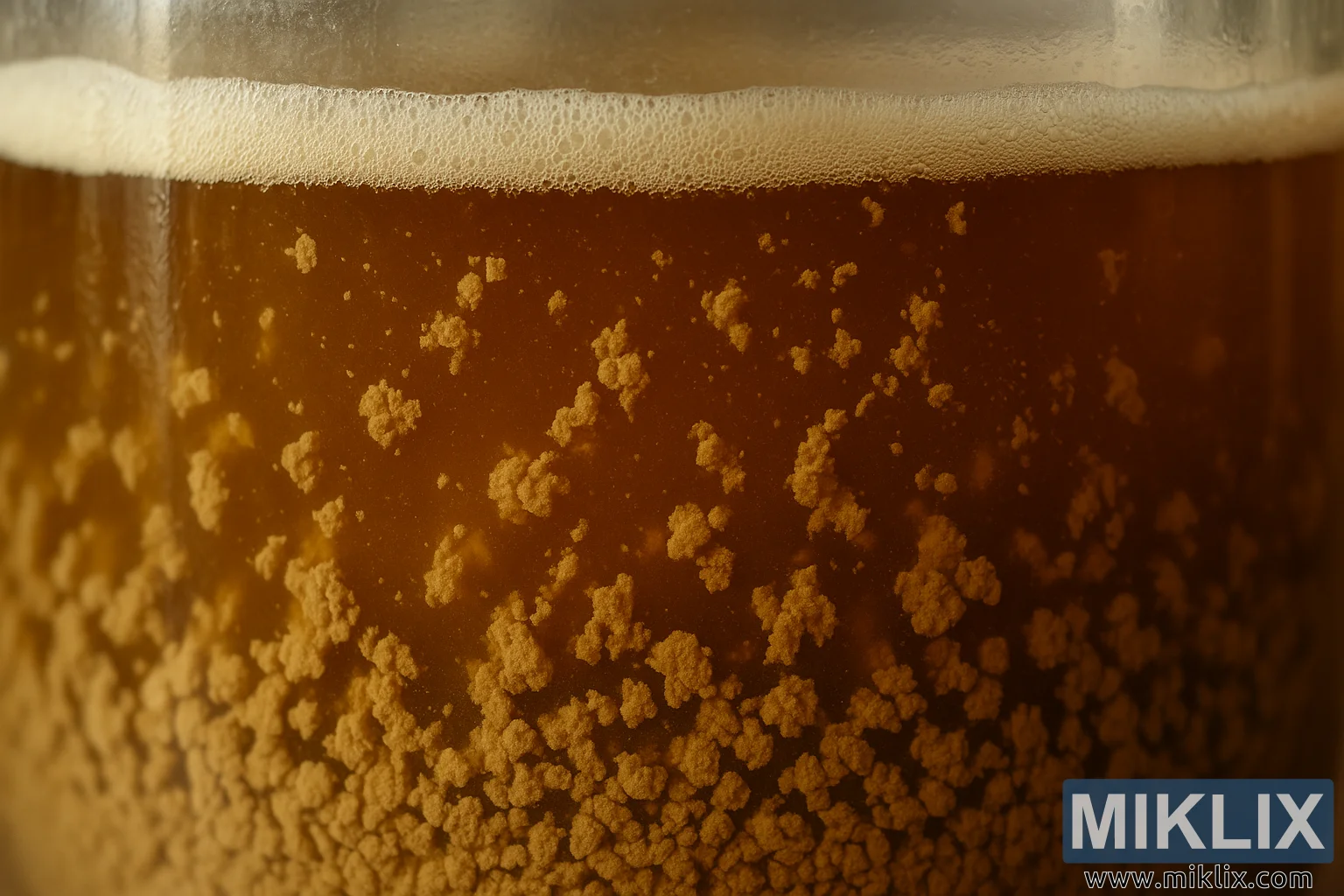 एक डिटेल्ड मैक्रो फ़ोटो जिसमें घर पर बनी ब्रिटिश एल के फ़र्मेंटेशन के दौरान कांच के फ़र्मेंटेशन बर्तन के अंदर यीस्ट के फ़्लोक्यूलेशन को कैप्चर किया गया है।