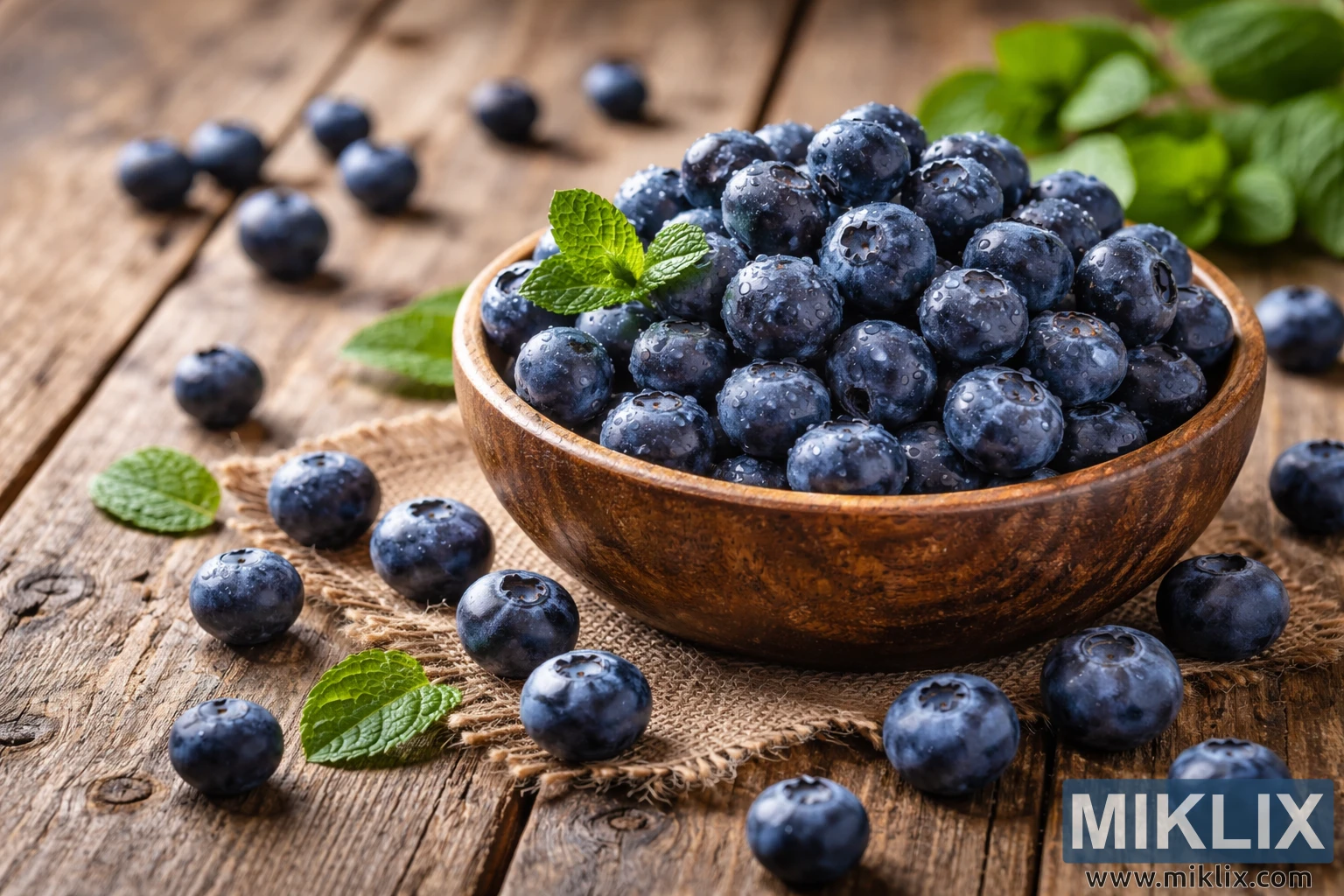 एक चौड़ी, लैंडस्केप वाली खाने की फ़ोटो में ताज़ी ब्लूबेरी को एक देहाती लकड़ी के टेबलटॉप पर बिखरा हुआ दिखाया गया है। लकड़ी की सतह साफ़ तौर पर खराब दिख रही है, जिसमें लंबी दानेदार लाइनें, हल्की दरारें, और गर्म भूरे और शहद जैसे हल्के बदलाव हैं जो सीन को एक फार्महाउस, कारीगर जैसा लुक देते हैं। ब्लूबेरी आगे और बीच में ज़्यादा हैं, हर बेरी मोटी और गोल है, उनके छिलके गहरे नीले से आधी रात के नीले रंग के हैं, जिनमें हल्के ग्रेडिएंट हैं जो रोशनी पड़ने पर बैंगनी रंग की ओर बदल जाते हैं। कई बेरीज़ में एक खास धूल भरा, चांदी जैसा फूल दिखता है जो उनकी सतह पर चिपका रहता है, जिससे एक हल्का मैट टेक्सचर बनता है जो कभी-कभी चमकदार हाइलाइट्स के साथ कंट्रास्ट करता है।
