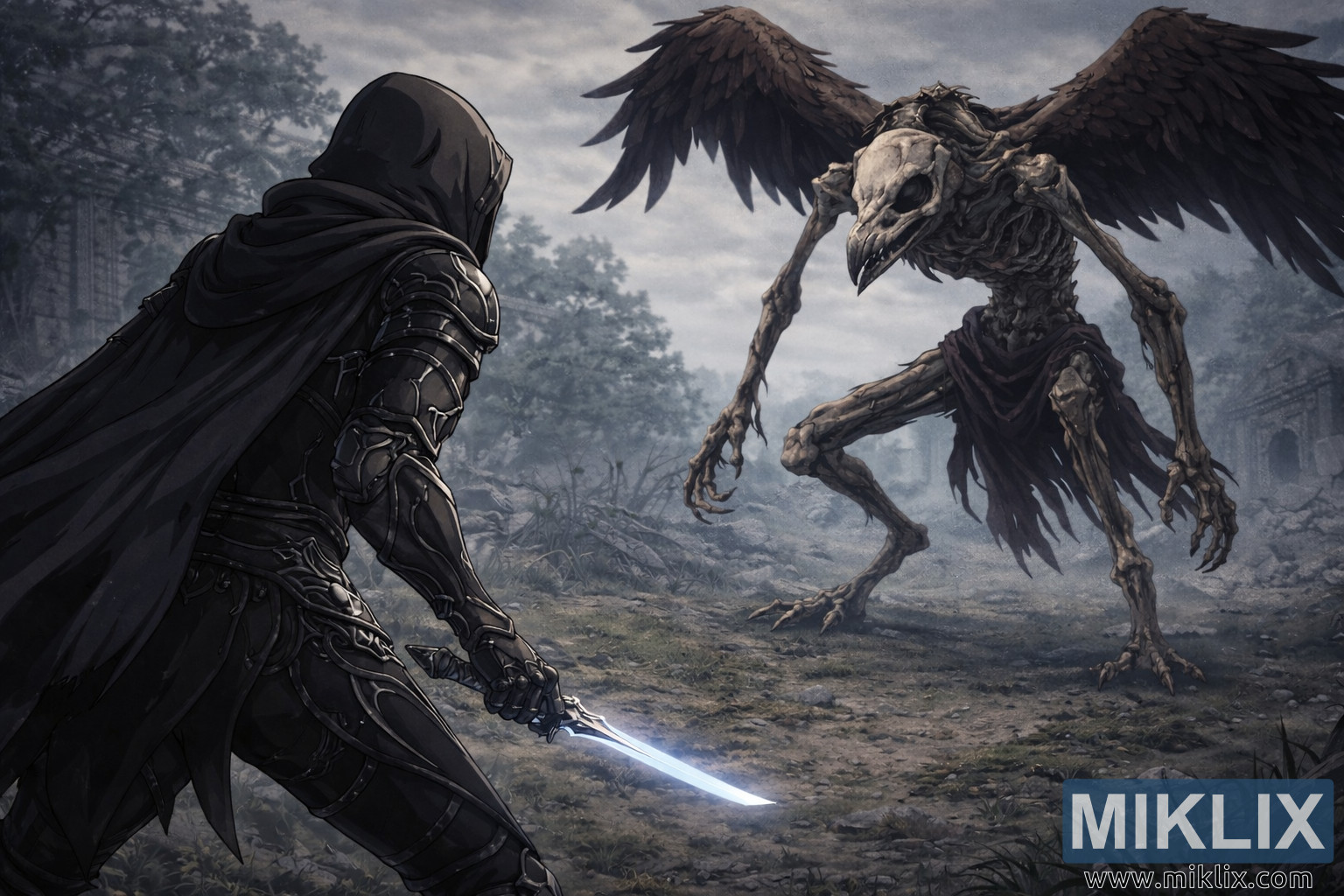 Široka filmska ilustracija u anime stilu prikazuje napeti trenutak mirnoće neposredno prije bitke između usamljenog ratnika Potamnjelog i visokog šefa Smrtonosne ptice na pustom Plačućem poluotoku. Scena je komponirana u pejzažnoj orijentaciji, naglašavajući udaljenost, atmosferu i neugodnu ravnotežu između lovca i plijena. U lijevom prvom planu stoji Potamnjeli, djelomično viđen straga, stvarajući impresivnu perspektivu preko ramena koja gledatelja izravno uvlači u sukob. Ratnik je odjeven u elegantan oklop Crnog noža detaljno ukrašen slojevima ploča, suptilnim gravurama i mat crnim metalnim teksturama koje apsorbiraju većinu ambijentalnog svjetla. Tamna kapuljača prekriva glavu i ramena, skrivajući crte lica i pojačavajući dašak misterije. Plašt lagano leprša kao da ga pokreće hladan obalni vjetar, dodajući pokret inače zamrznutom trenutku. U desnoj ruci Potamnjelog, kratki bodež svijetli suzdržanom plavkastom svjetlošću, bacajući slabašan odraz duž rubova oklopa i nježno osvjetljavajući blatnjavo tlo ispod, a da ne nadjača prigušenu paletu okoliša.