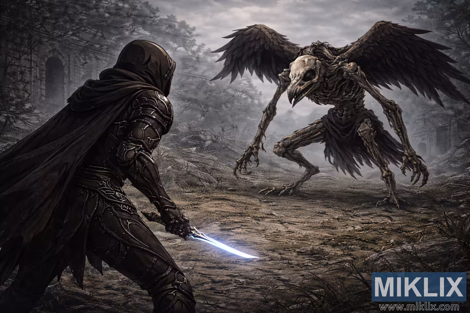 Polurealistična mračna fantasy umjetnost obožavatelja koja prikazuje ratnika s kapuljačom u crnom oklopu kako se izbliza suočava s kosturnim stvorenjem ptice u ruševinama prekrivenim maglom prije bitke.