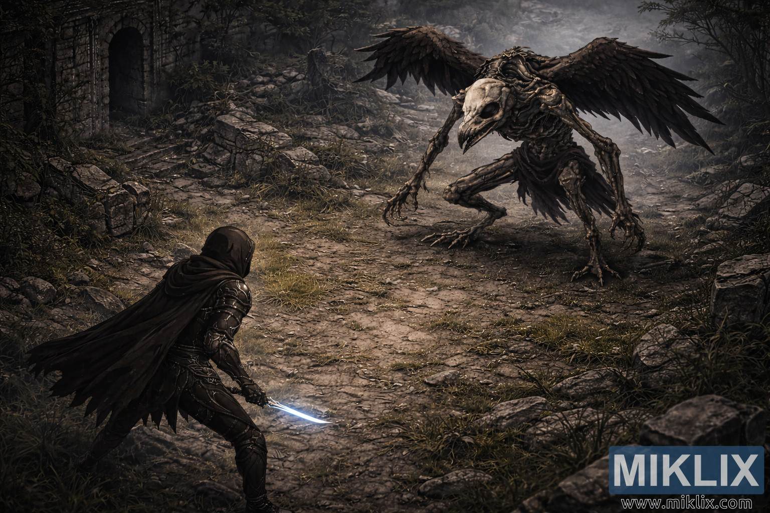 Polurealistična mračna fantastična ilustracija koja prikazuje ratnika s kapuljačom i užarenim bodežom okrenutog prema kosturnoj ptici iz uzdignute izometrijske perspektive u maglovitim ruševinama.