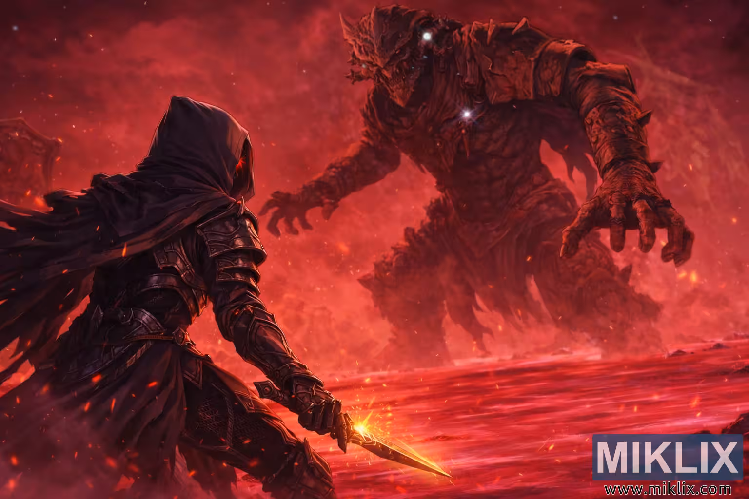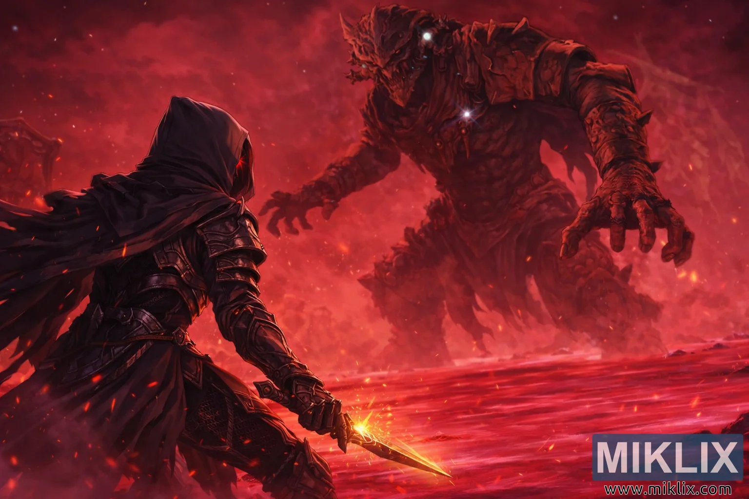 Slika prikazuje dramatičnu scenu u anime stilu inspiriranu Elden Ringom, smještenu duboko u korumpiranom prostranstvu Jezera truljenja. Kompozicija je prikazana u širokom, filmskom pejzažnom formatu, uranjajući gledatelja u neprijateljsko grimizno okruženje gdje se samo tlo čini tekućim, sjajeći otrovnim grimiznim nijansama. Gusta crvena magla valja se preko bojnog polja, raspršujući svjetlost i dajući cijeloj sceni opresivnu, onostranu atmosferu. Mrlje čestica nalik žeravici lebde zrakom, pojačavajući osjećaj opasnosti i propadanja koji definira ovo zabranjeno mjesto.
