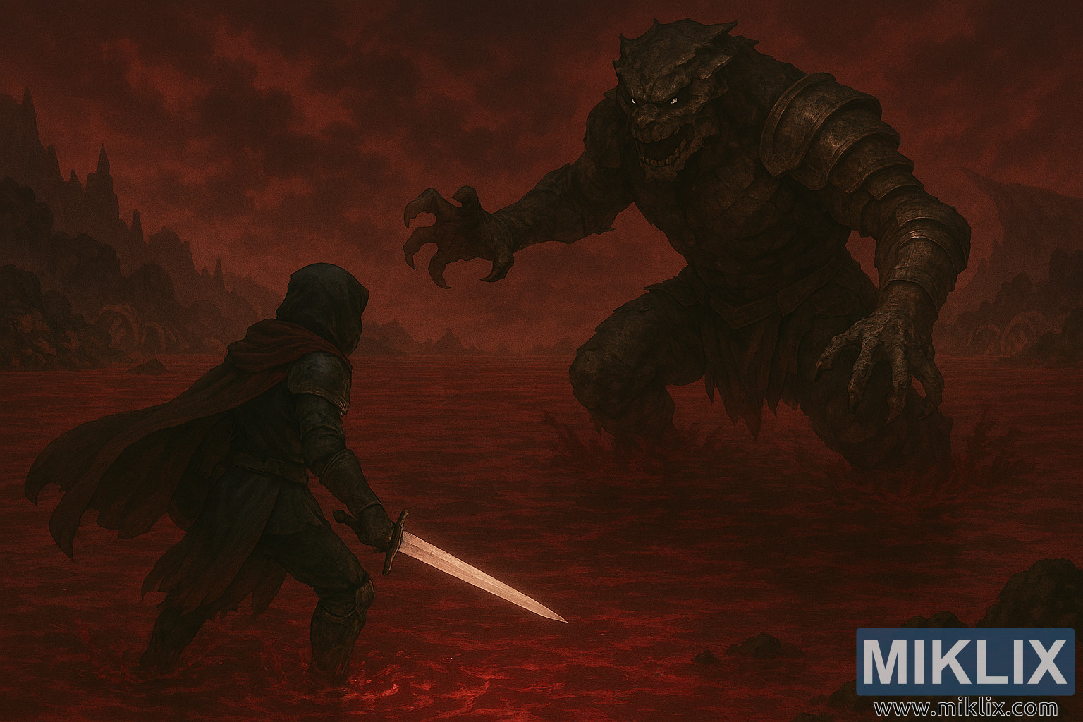 Bogato detaljna digitalna slika u polurealističnom stilu mračne fantastike prikazuje napet sukob u Elden Ringovom Jezeru truljenja. Kompozicija se promatra iz blago povišenog izometrijskog kuta, nudeći široku perspektivu grimizne bojne površine. Potamnjeli, odjeven u oklop Crnog noža, stoji staloženo na lijevoj strani slike, okrenut prema grotesknom Zmajevom vojniku koji se nadvija s desne strane.