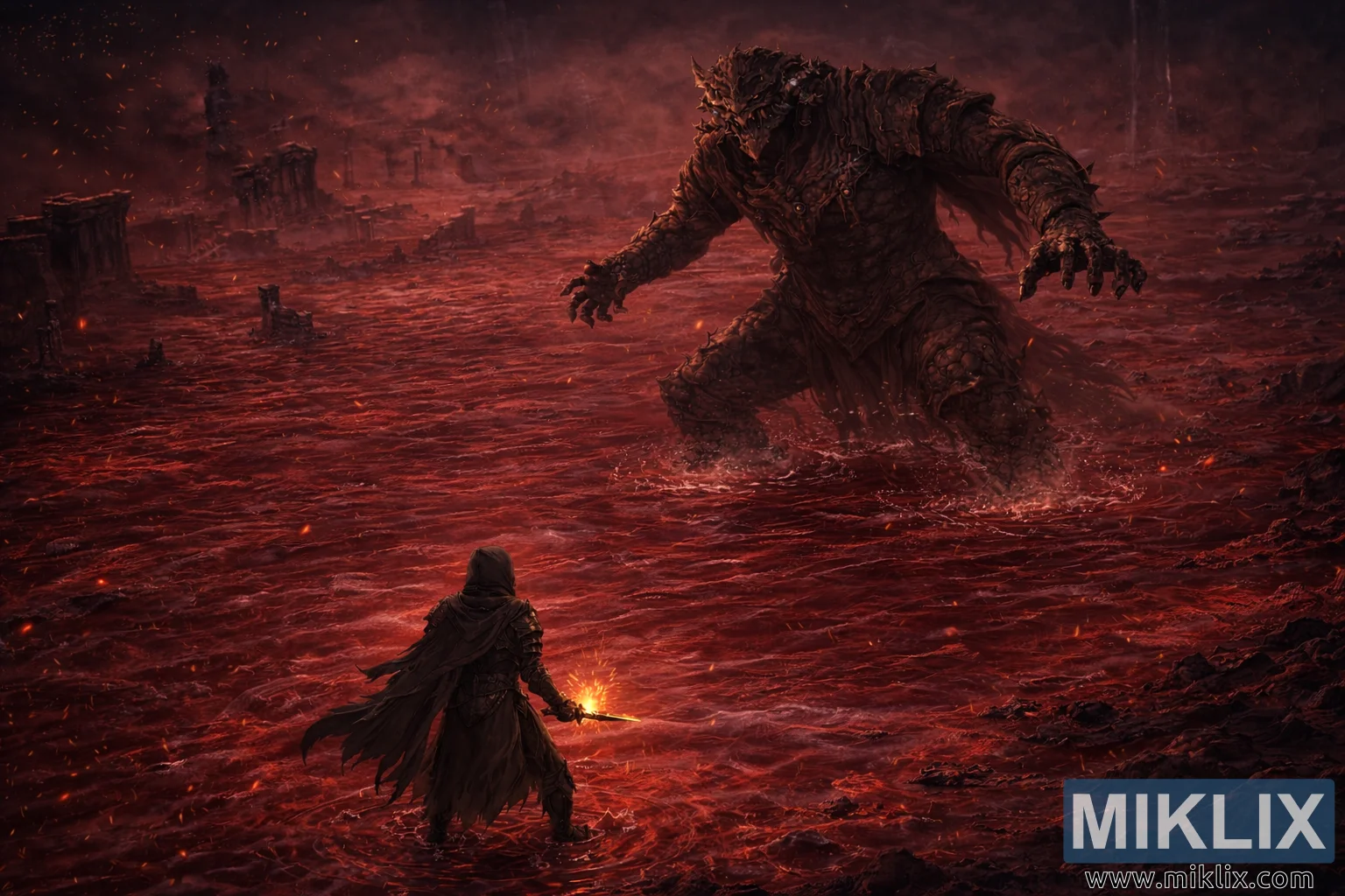 Slika prikazuje sumornu, realističnu scenu mračne fantastike inspiriranu Elden Ringom, gledanu iz uzvišene, izometrijske perspektive koja naglašava razmjere, atmosferu i izolaciju. Jezero truleži proteže se preko cijele kompozicije kao ogromno, korumpirano more duboke grimizne tekućine. Njegova površina izgleda debelo i teško, tromo se mreška kao da je prožeta otrovnom energijom. Suptilne iskre i čestice nalik žeravici lebde zrakom, dok gusta crvena magla prekriva daljinu, prigušujući detalje i stvarajući zagušljiv osjećaj propadanja. Razasuti po pozadini su slomljeni ostaci kamenih stupova i potopljenih ruševina, djelomično vidljivi kroz izmaglicu, nagovještavajući nekoć veliku strukturu koju je davno proždirala trulež.