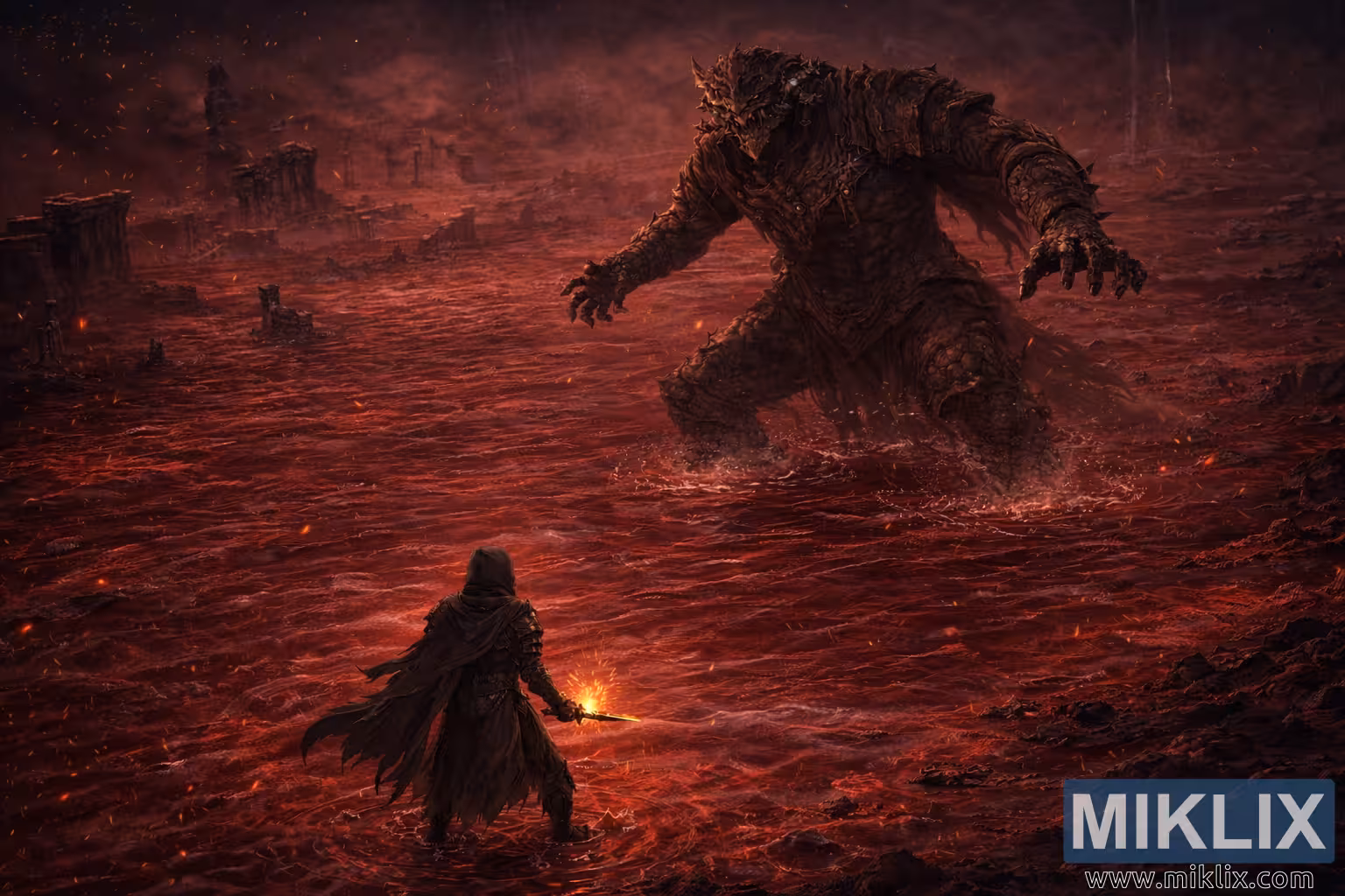 Sredinom prizora dominira Zmajev vojnik, masivno humanoidno stvorenje koje napreduje kroz jezero prema Potamnjelima. Njegov golemi oblik nadvija se nad scenom, odajući oduševljavajuću težinu i moć. Tijelo stvorenja izgleda kao da je isklesano od drevnog kamena i otvrdnutog mesa, prekriveno ispucalim, nazubljenim teksturama koje sugeriraju veliku starost i brutalnu izdržljivost. Za razliku od ranijih prikaza, Zmajev vojnik nema svjetleće bijele točke ili arkana svjetla; njegovu prisutnost definira isključivo masa, sjena i fizička prijetnja. Jedna ruka pruža se naprijed s raširenim kandžama, dok druga ostaje savijena i teška uz bok. Svaki korak silovito muti grimiznu tekućinu, šaljući prskanja i valove prema van koji naglašavaju samu težinu stvorenja.