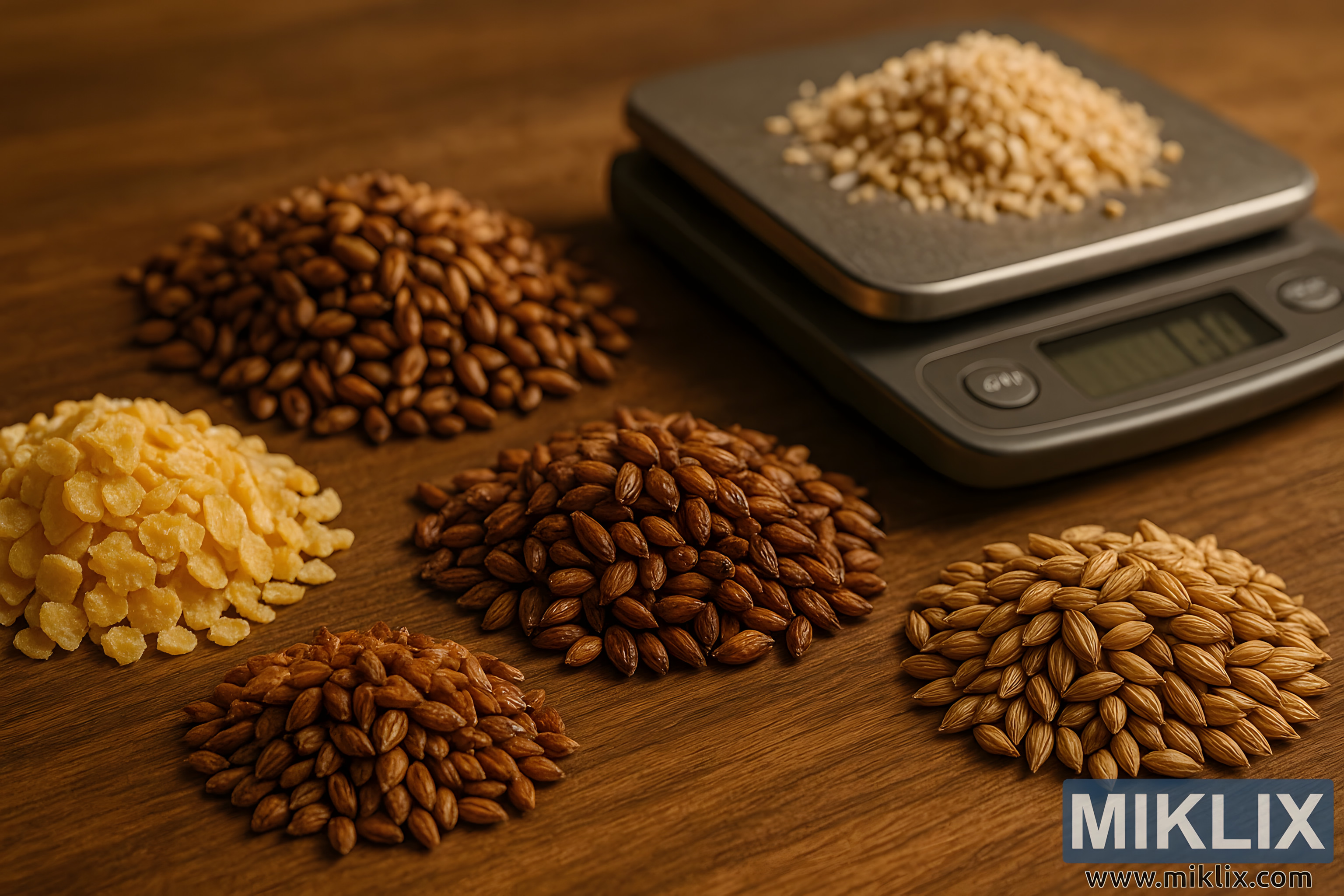 Ostale hrpe, raspoređene u polukrug oko vage, uključuju zrna koja nalikuju pahuljastom kukuruzu, kristalnom sladu, blijedom sladu i moguće pšenici ili ječmu. Svako ima svoj vizualni identitet: pahuljasti kukuruz je svijetao i nepravilan, kristalni slad je tamniji i ujednačeniji, a blijedi slad je gladak i zlatan. Zajedno tvore vizualnu priču o ravnoteži i namjeri, kompoziciju koja govori o pivarovom razumijevanju načina na koji ti elementi međusobno djeluju. Drvena površina ispod njih dodaje rustikalni šarm, a njezine godove i nesavršenosti pojačavaju taktilnu prirodu rada. Ovo nije sterilni laboratorij - to je radni prostor oblikovan tradicijom, intuicijom i potragom za okusom.