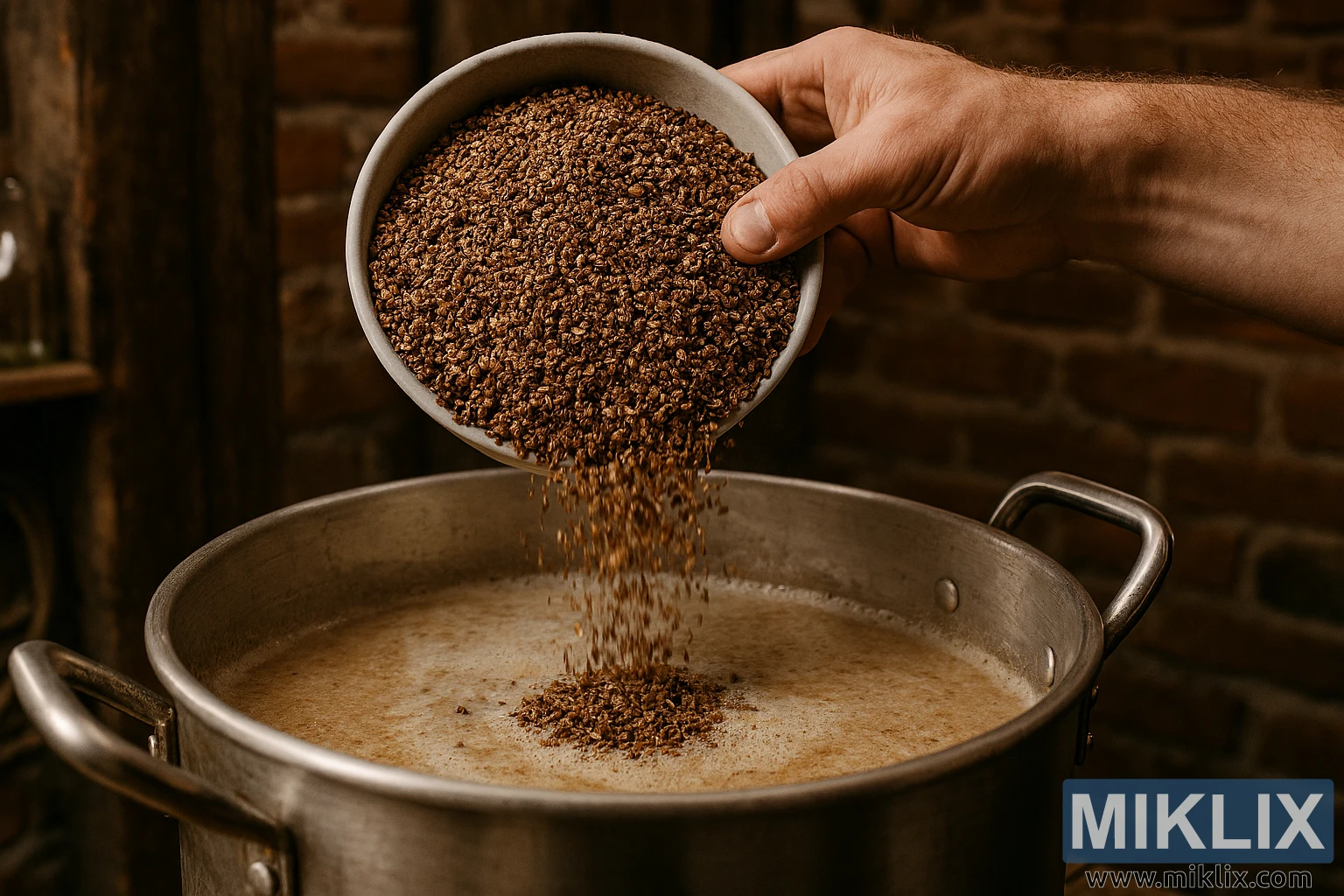 Krupni plan dodavanja usitnjenog prženog ječma u lonac za slađenje u rustikalnom okruženju kućnog pivarstva, ističući teksturu, toplinu i tradiciju pivarstva.